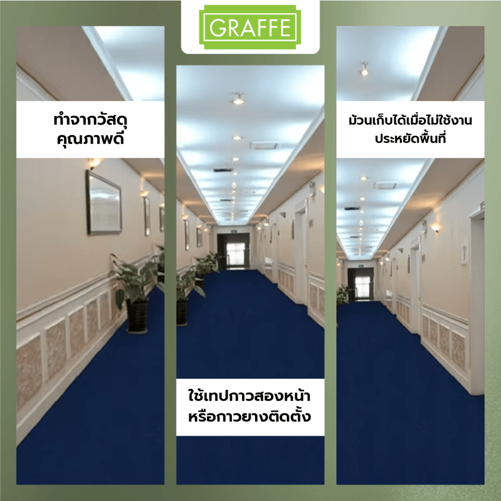 พรมอัดลูกฟูก ผลิตจากเส้นใยโพลีเอสเตอร์ เส้นใยหนานุ่ม ทำให้รู้สึกสบายเท้าเมื่อสัมผัส ใช้งานง่าย เหมาะสำหรับงานแสดงสินค้า ทั้งภายในและภายนอกอาคาร