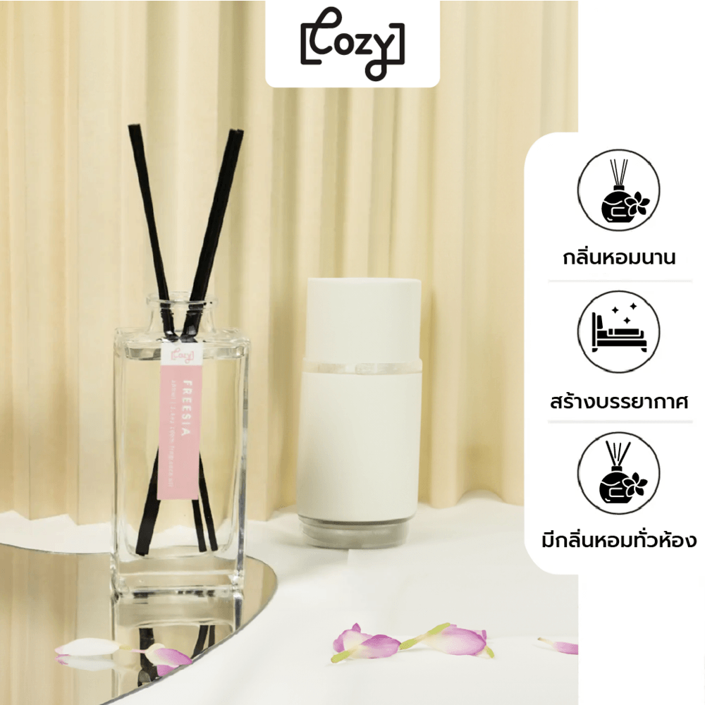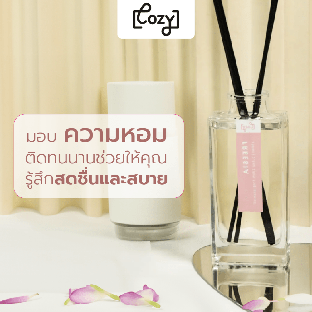 ก้านกระจายความหอม จากแบรนด์ COZY มาพร้อมน้ำหอมกลิ่น Freesia ให้คุณรู้สึกผ่อนคลายสบายอารมณ์ มาพร้อมกลิ่นหอมติดทนนาน ช่วยปรับบรรยากาศภายในห้องให้คุณรู้สึกผ่อนคลาย คลายความเมื่อยล้า หลังจากเหนื่อยจากการทำงาน