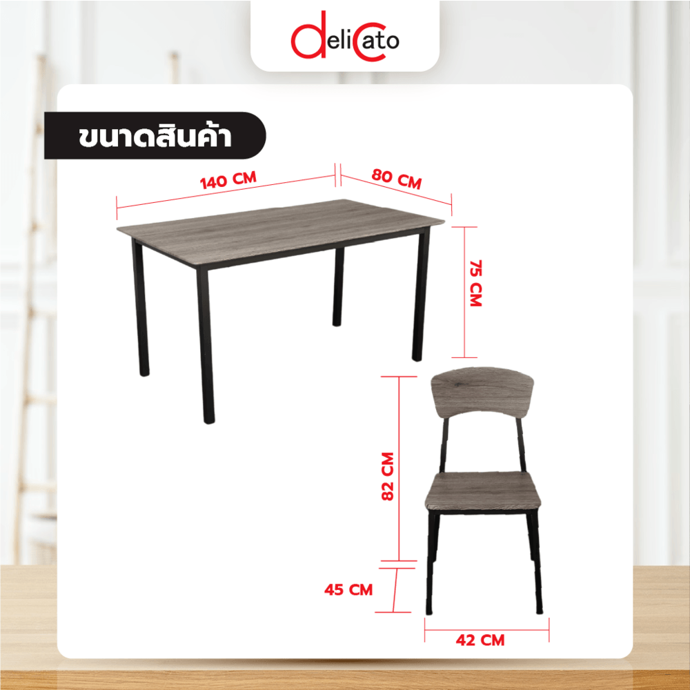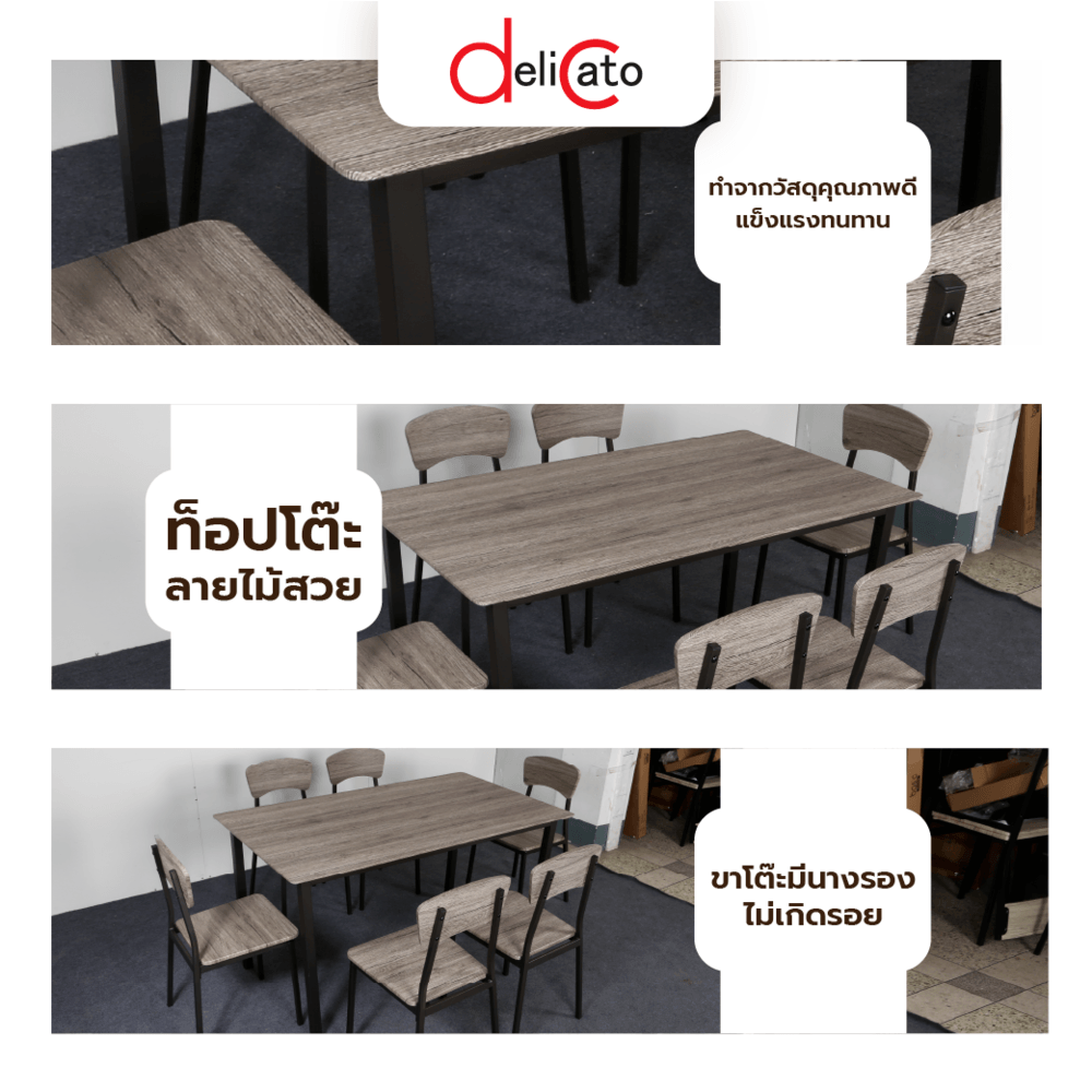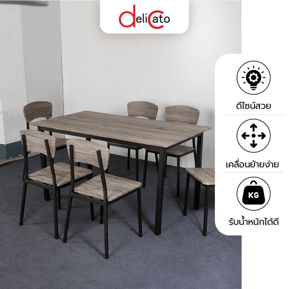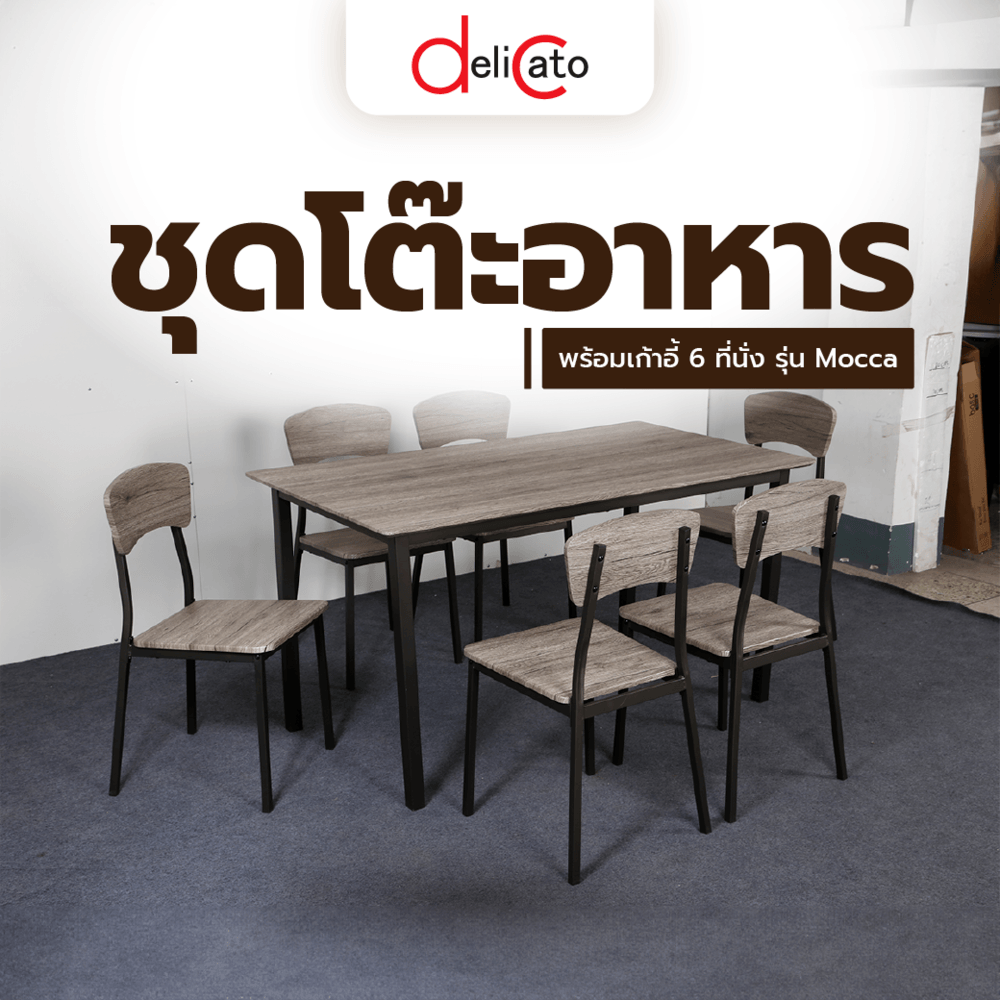 Delicato ชุดโต๊ะอาหารพร้อมเก้าอี้ 6 ที่นั่ง รุ่น Mocca สีน้ำตาล ดีไซน์สวย ทันมัย เพิ่มความอบอุ่นให้แก่บ้านของคุณด้วยสีของไม้ ชุดโต๊ะอาหารผลิตจากไม้ MDF และเหล็กคุณภาพดี ขาโต๊ะและเก้าอี้ที่ไม่ใหญ่มากช่วยให้พื้นที่ทานอาหารของท่านมีความโล่ง โปร่ง ทำให้สบายตาไม่อึดอัด เหมาะกับการจัดวางในพื้นที่ ๆ มีขนาดเล็กหรือจำกัด
