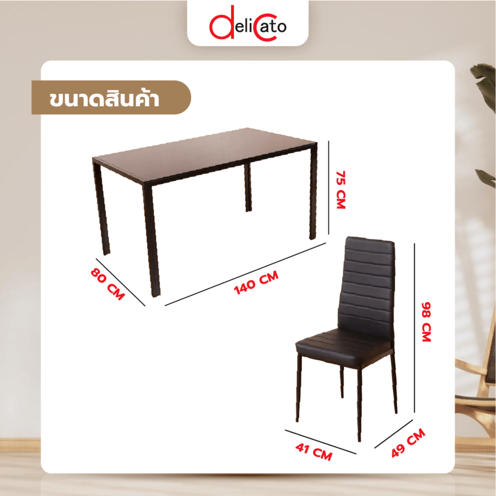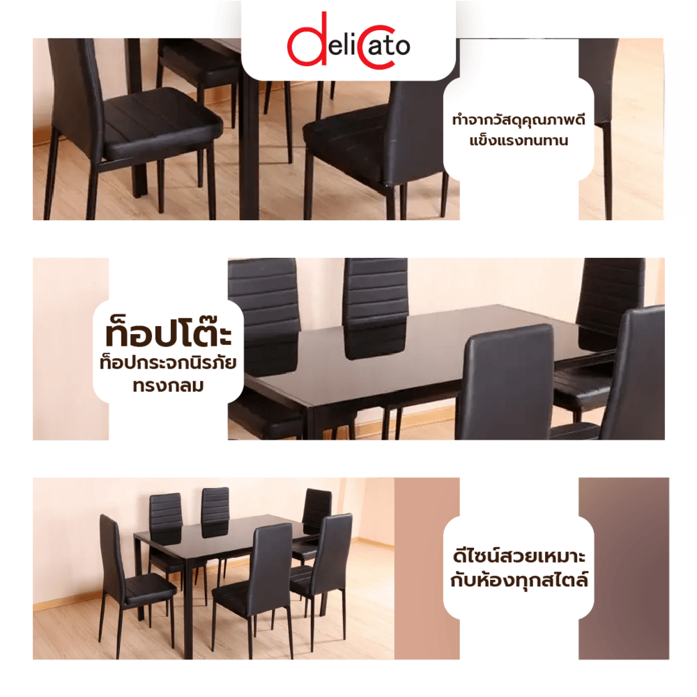 Delicato ชุดโต๊ะอาหาร 6 ที่นั่ง รุ่น D02082 โต๊ะ:140X80X75ซม. เก้าอี้:41X49X98ซม. สีดำ