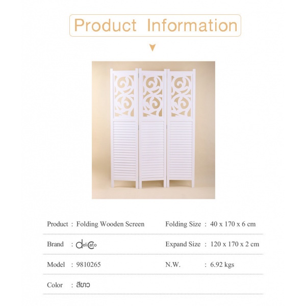 Delicato ฉากกั้นห้อง 3 บาน ขนาด 120X170X2ซม. สีขาว