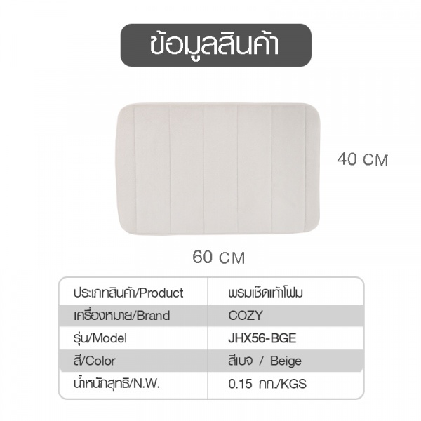 พรมเช็ดเท้าโฟม Cozy ขนาด 40×60×1.2ซม. สีเบจ