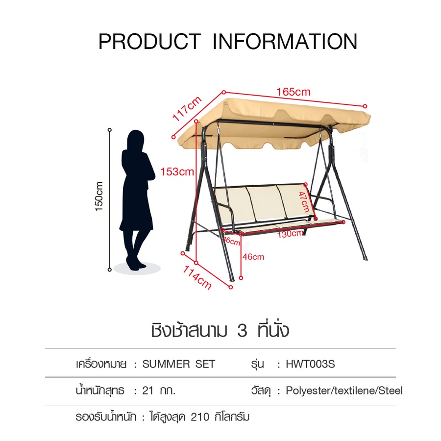 ให้ความผ่อนคลายได้ทุกเมื่อด้วย ชิงช้า 3 ที่นั่ง ดีไซน์สวยงามมีเอกลักษณ์เฉพาะตัว โครงสร้างชิงช้า ผลิตจากเหล็กขัดผิวเรียบพ่นสี ให้ความแข็งแรงทนทานต่อการใช้งาน ที่นั่งผลิตจากผ้า รองรับสรีระได้ดี มีพนักเท้าแขนบริเวณด้านข้างของขอบม้านั่งทั้ง 2 ด้าน มาพร้อมหลังคาที่ช่วยกันแสงแดด และละอองจากน้ำ สามารถดูดซึมความชื้นได้ดี ชิงช้าสามารถโยกแก่วงไป-มาได้ เหมาะสำหรับนำไปวางบริเวณสวนหน้าบ้าน หรือสนามภายในบ้านได้ เพิ่มความผ่อนคลาย และให้ความเพลิดเพลินจากการนั่งชมนกชมไม้ได้มากขึ้น