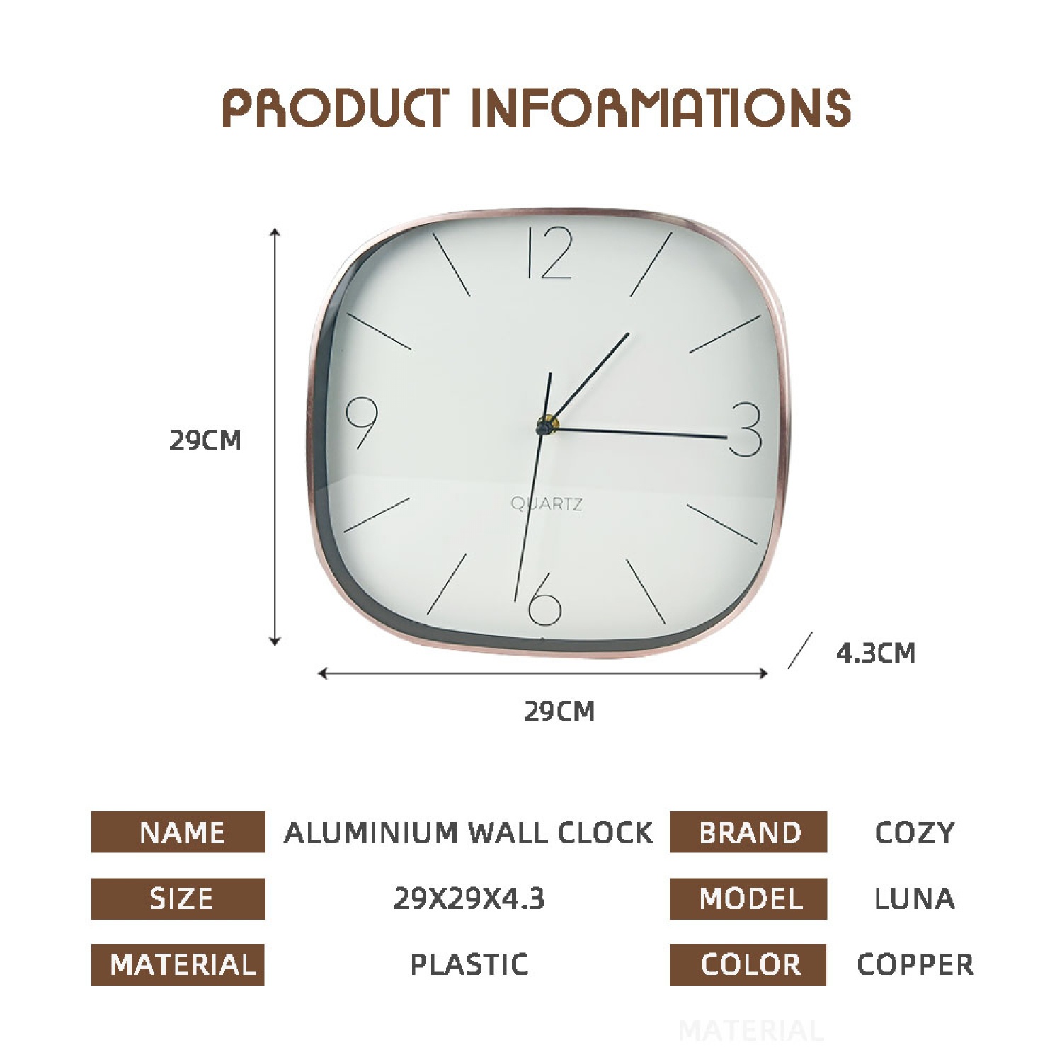 COZY นาฬิกาแขวนทรงเหลี่ยมอลูมิเนียม รุ่น LUNA ขนาด 29x29x4.3ซม. สีทองแดง