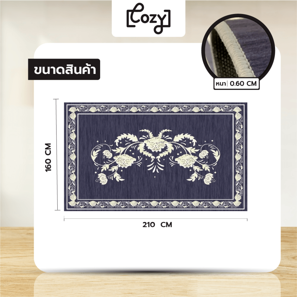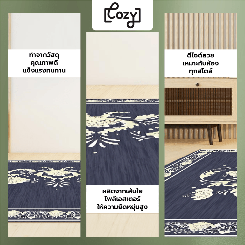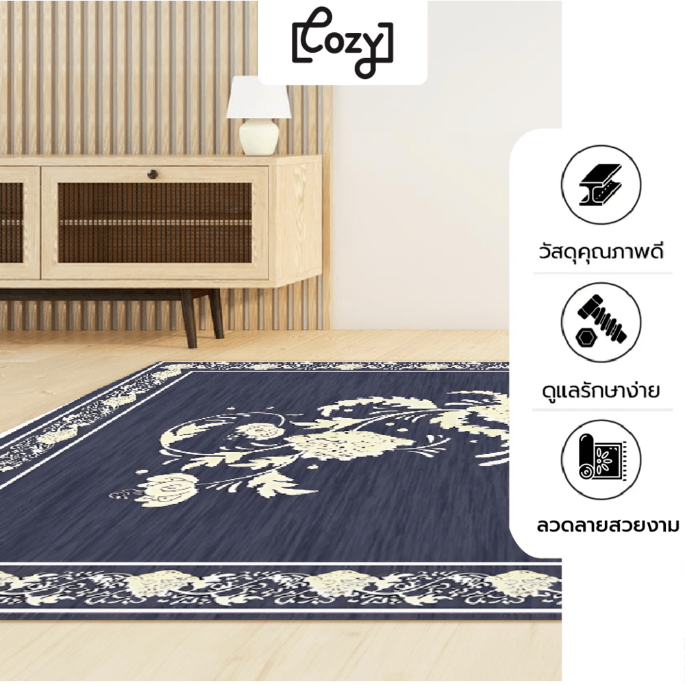 เหมาะสำหรับใช้ประดับตกแต่งพื้นห้องเพื่อความสวยงาม ผลิตจากเส้นใยโพลีเอสเตอร์ ผ่านการผลิตที่พิถีพิถันจากแบรนด์ COZY พร้อมออกแบบดีไซน์ลวดลายสวยงาม ช่วยตกแต่งเพิ่มความโดดเด่นเป็นเอกลักษณ์ให้กับบ้าน