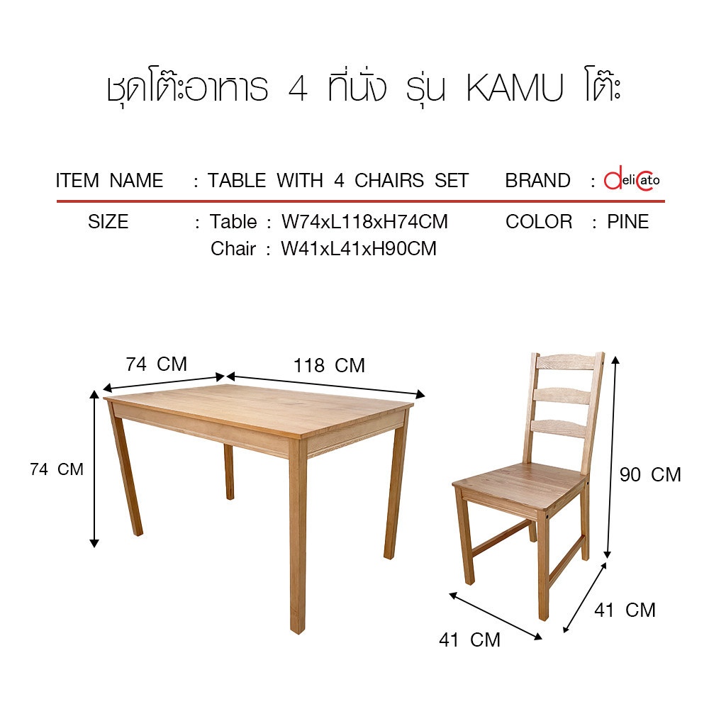 DELICATO ชุดโต๊ะอาหาร 4 ที่นั่ง รุ่น KAMU โต๊ะ: 74x118x74 ซม. เก้าอี้:41x41x90 ซม. สีไม้ธรรมชาติ
