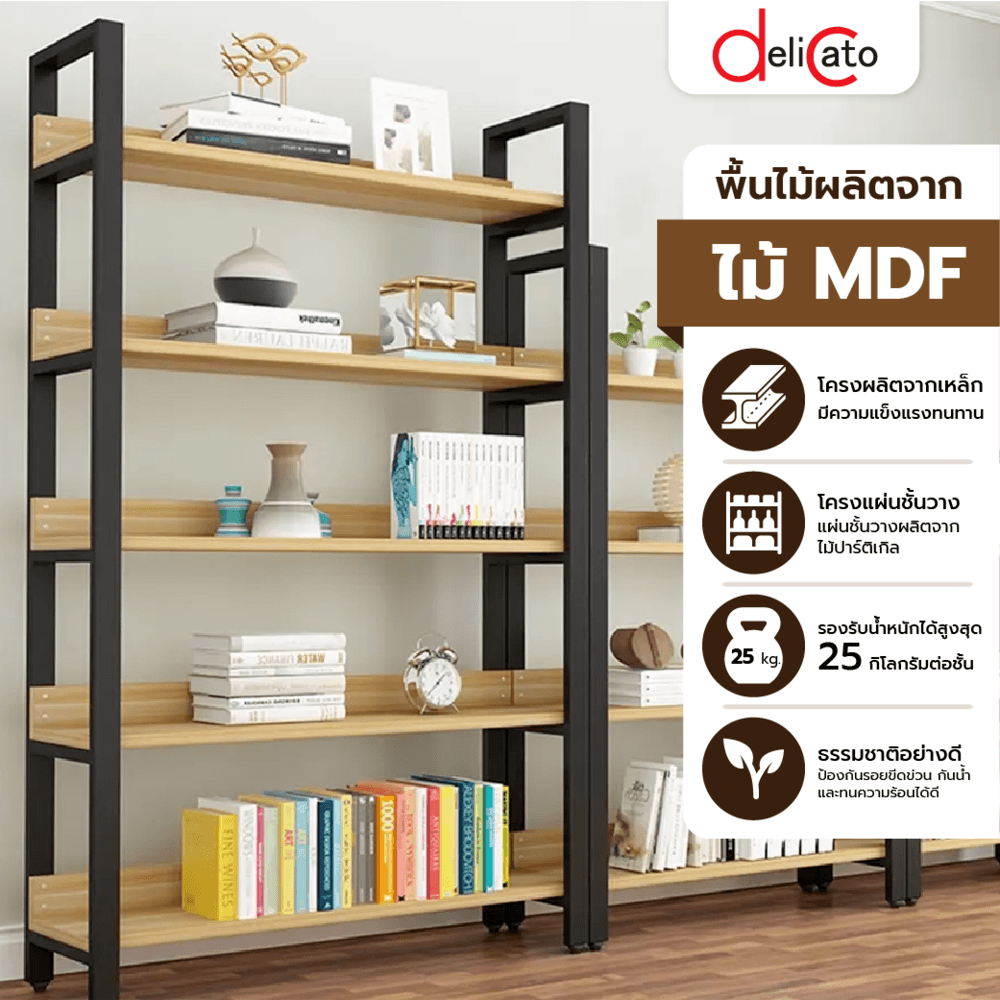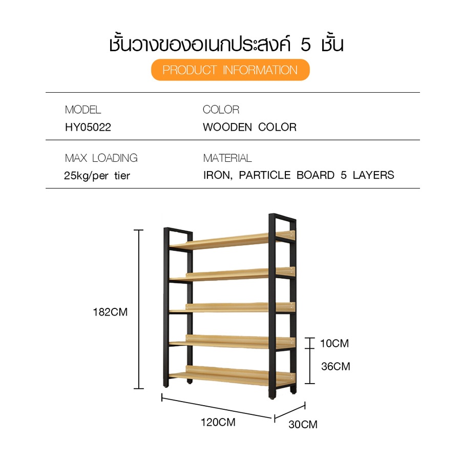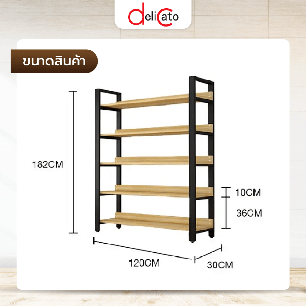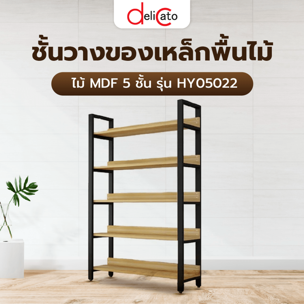 DELICATO ชั้นวางของเหล็กพื้นไม้ MDF 5 ชั้น รุ่น HY05022 ขนาด 30x120x182 ซม. สีไม้ มีแผ่นไม้กันตก