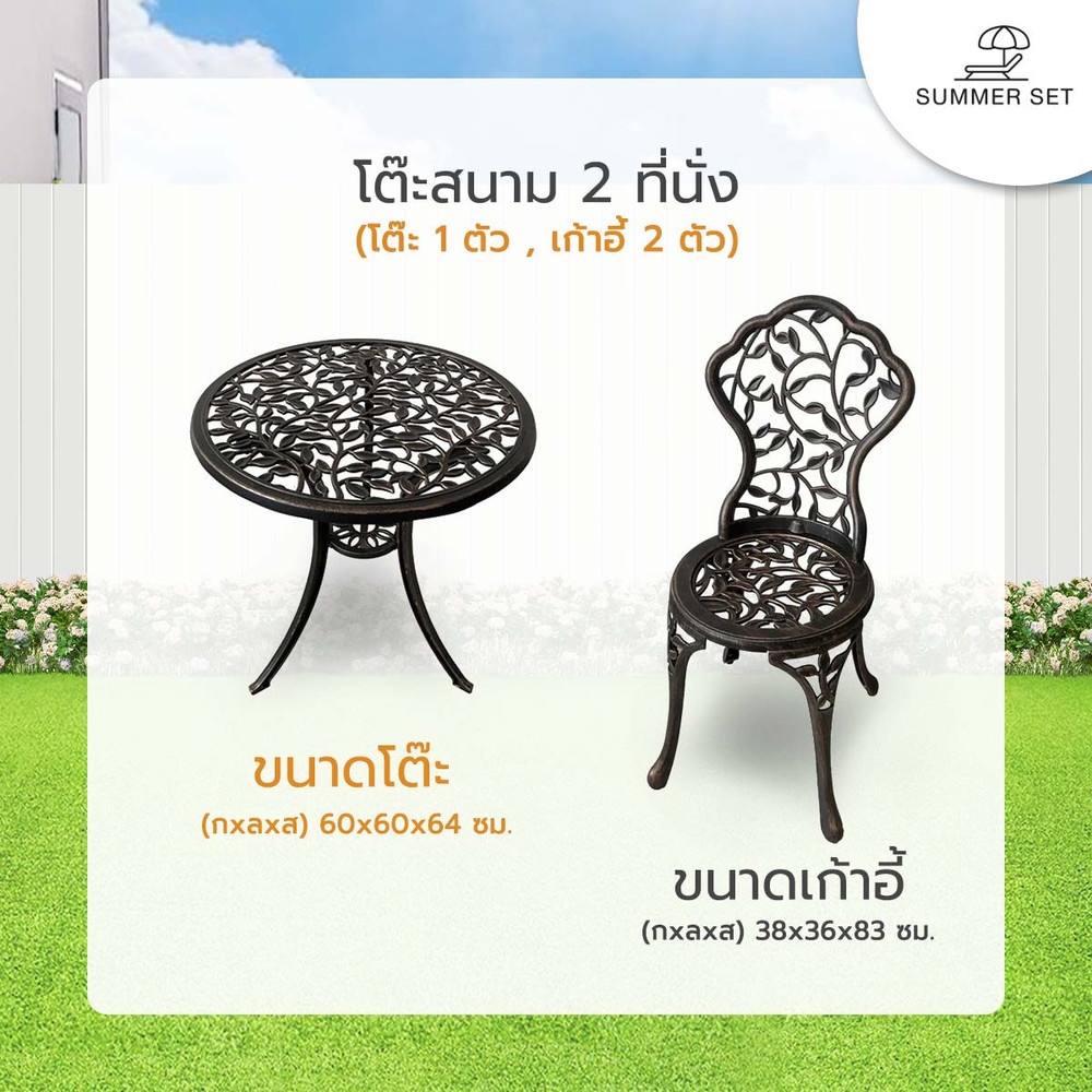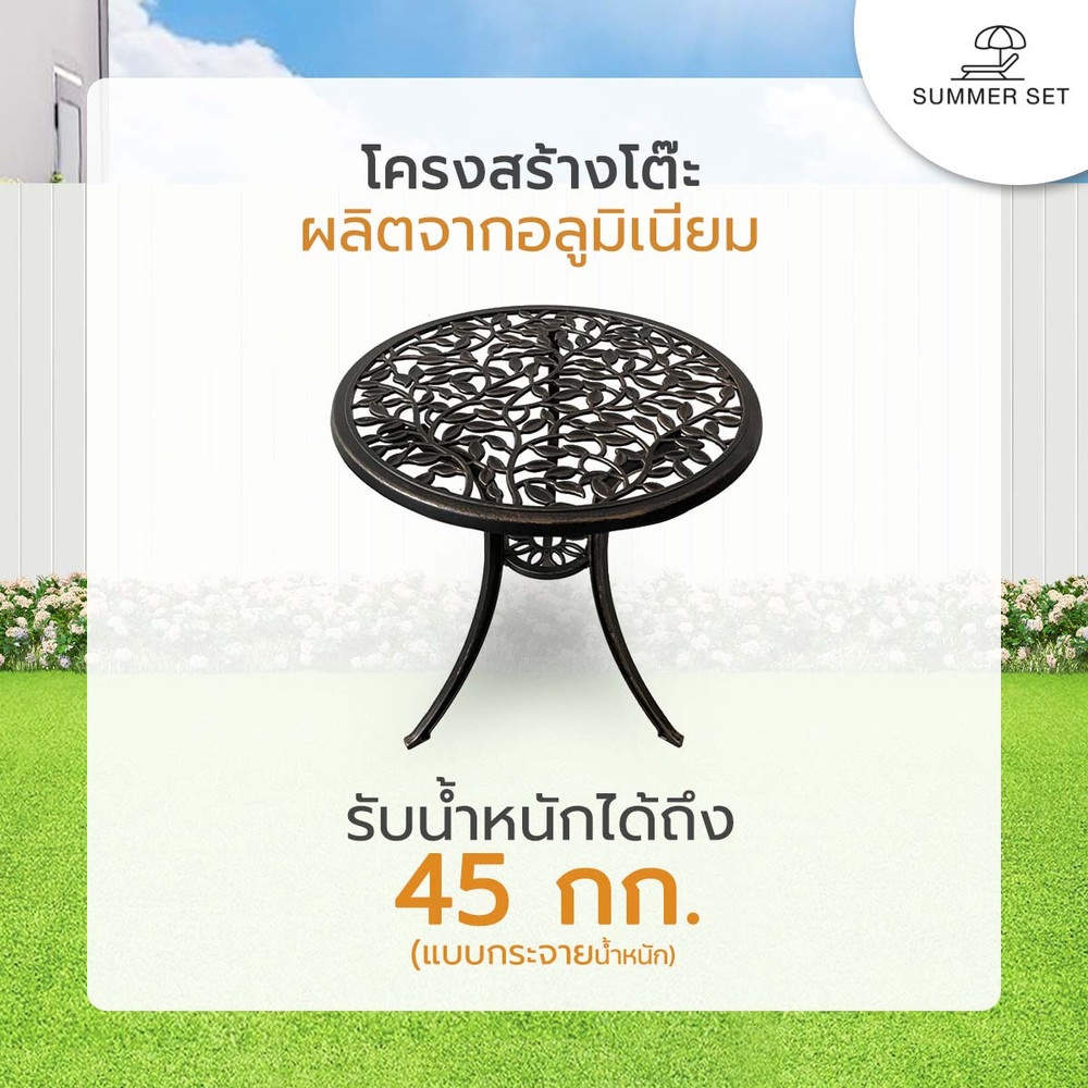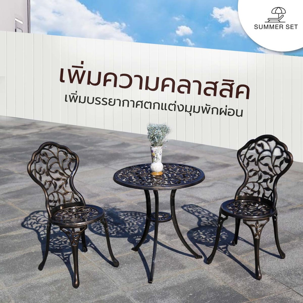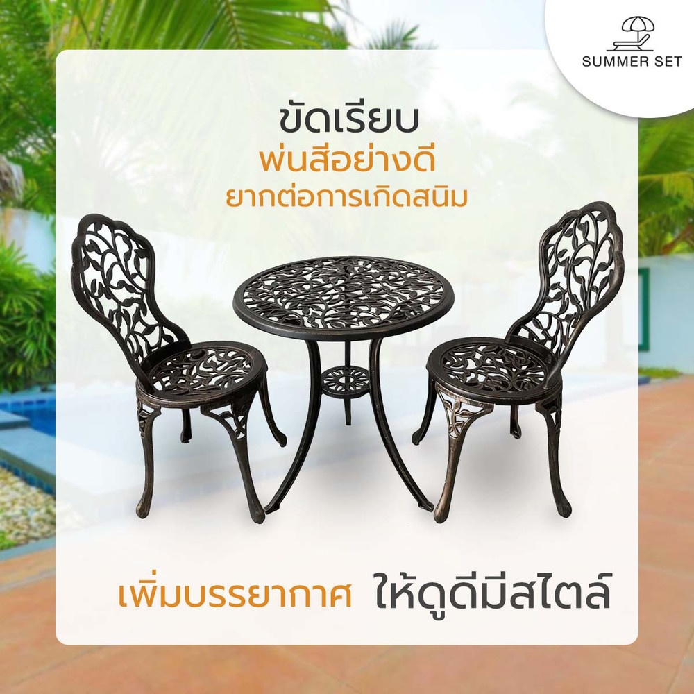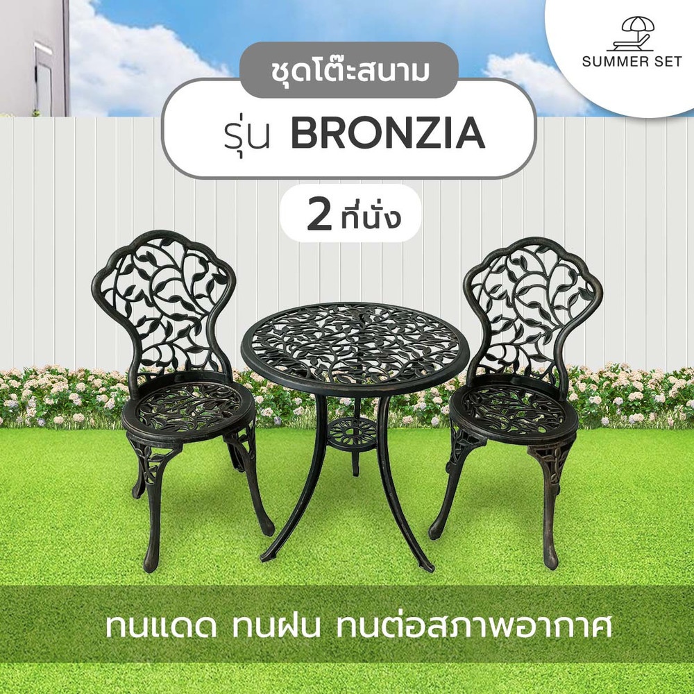 เพิ่มบรรยากาศตกแต่งมุมพักผ่อนให้ดูมีสไตล์มากกว่าที่เคยด้วย ชุดโต๊ะสนาม 2 ที่นั่ง รุ่น BRONZIA จาก SUMMER SET โครงสร้างผลิตจากอลูมิเนียมคุณภาพสูง ขัดเรียบและพ่นสีอย่างดี ยากต่อการเกิดสนิม ทนทาน รองรับน้ำหนักได้มาก