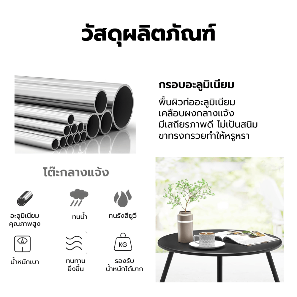 วัสดุหลักของโต๊ะคือ อลูมิเนียม ซึ่งเป็นโลหะที่มีน้ำหนักเบาแต่แข็งแรง ทนต่อสภาพอากาศและไม่เกิดสนิมแม้ใช้งานภายนอกบ้านเป็นเวลานาน อลูมิเนียมยังเป็นวัสดุที่ทำความสะอาดง่ายและดูแลรักษาได้สะดวก เหมาะกับสภาพอากาศของประเทศไทยที่มีทั้งแดดแรงและฝนตกชุก โต๊ะรุ่นนี้จึงตอบโจทย์การใช้งานในทุกฤดูกาล