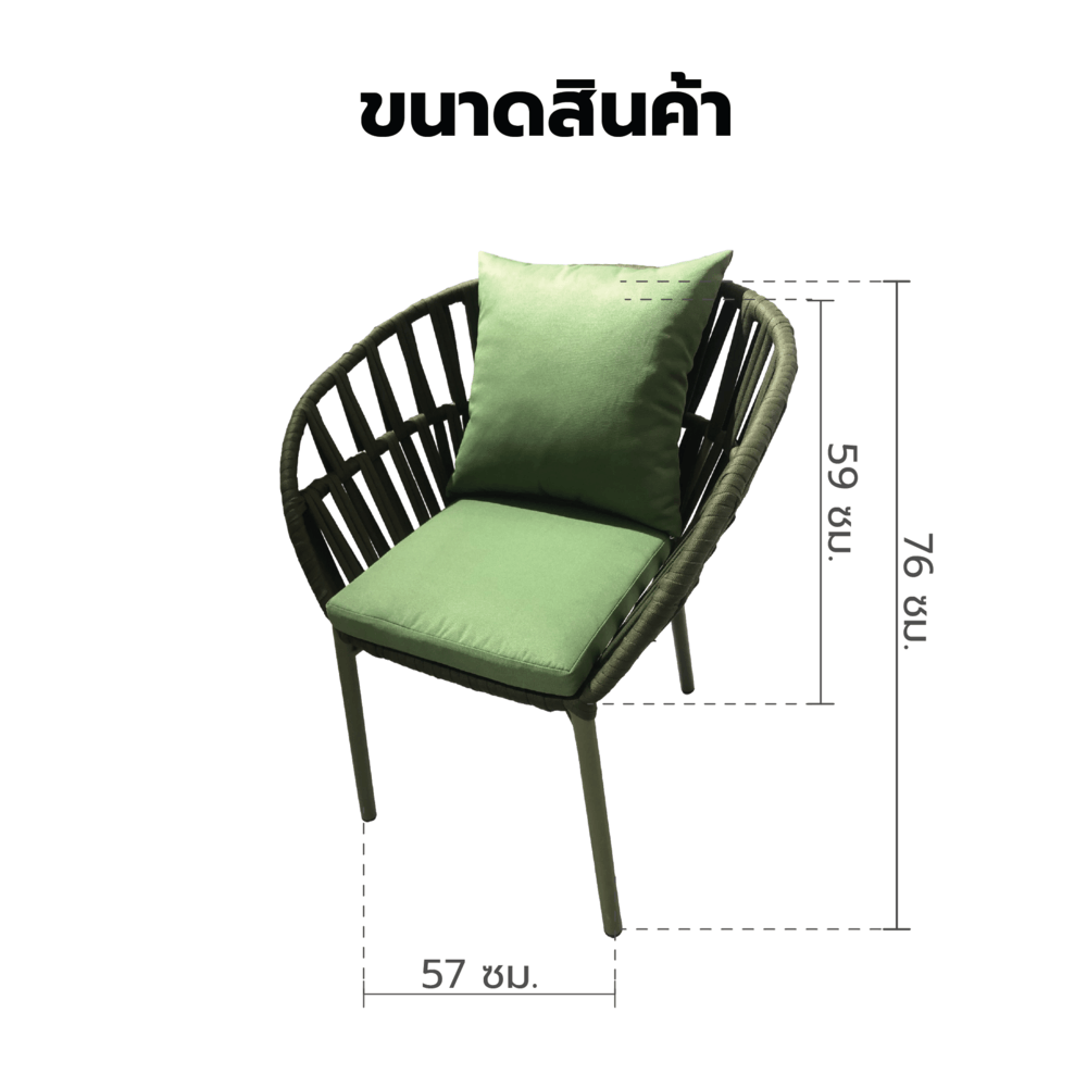 เก้าอี้มีขนาด 57 x 59 x 76 ซม. ซึ่งเป็นขนาดที่พอเหมาะสำหรับการใช้งาน ไม่กินพื้นที่มากนัก และสามารถนำไปจัดวางในมุมพักผ่อนได้อย่างลงตัว