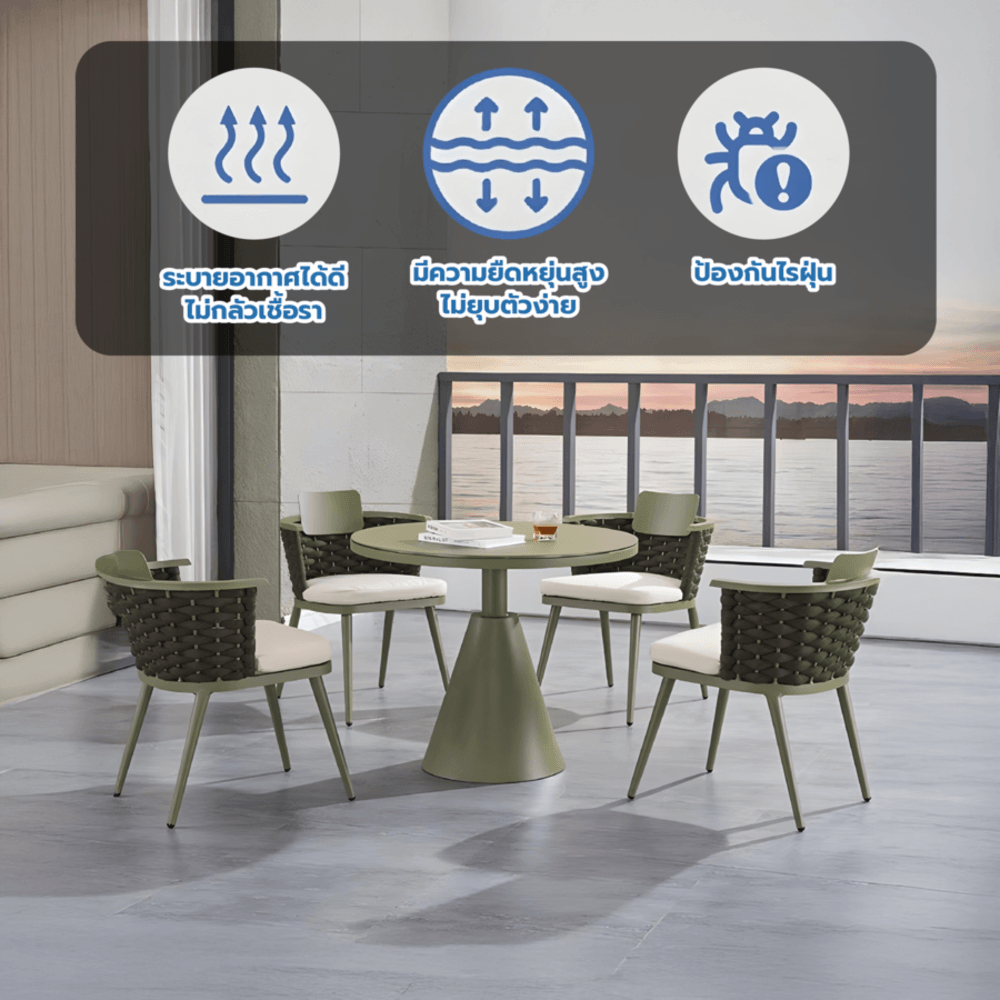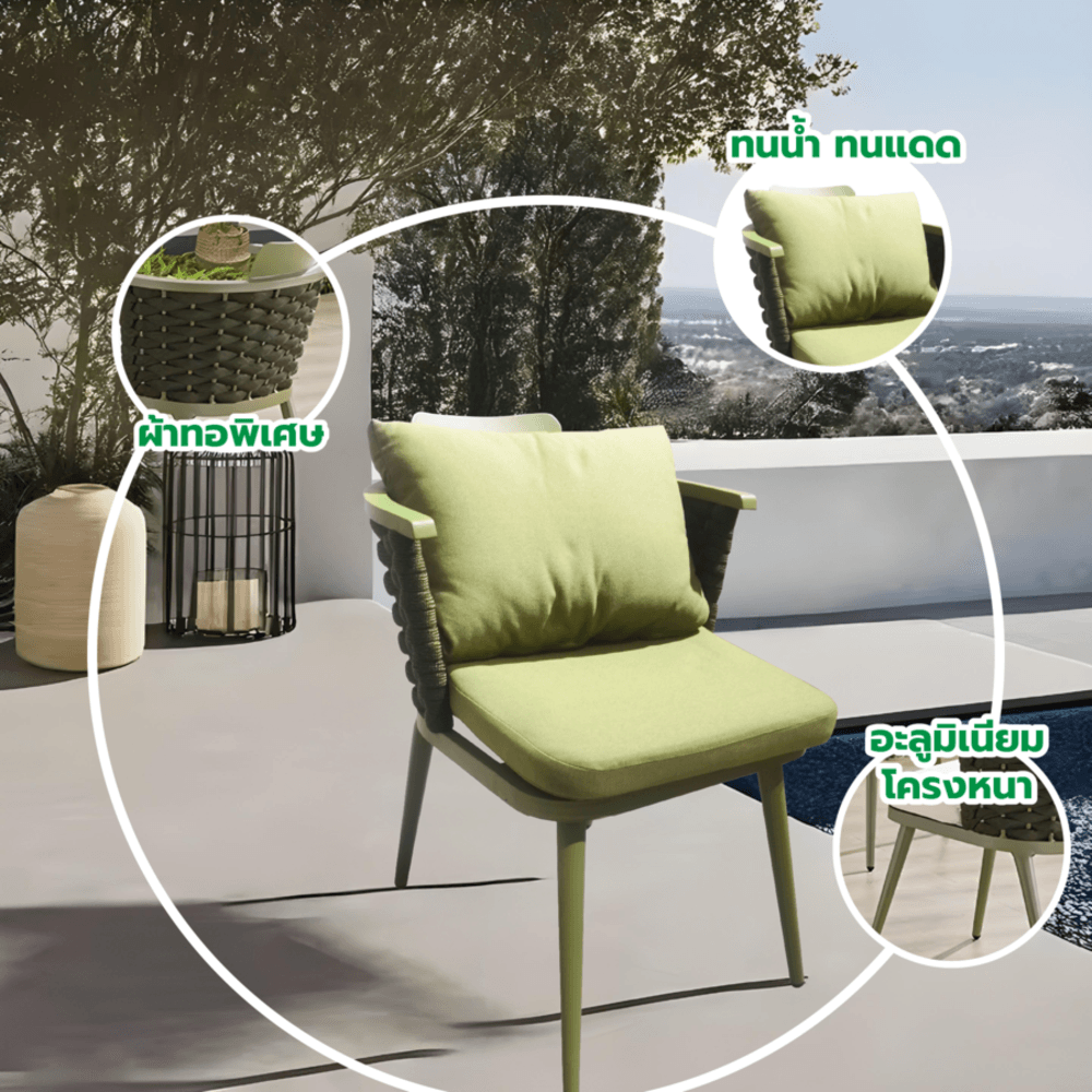 SUMMER SET รุ่น Racha มาในโทน สีเขียว (Green) ที่ให้ความรู้สึกสดชื่น สบายตา และเข้ากับบรรยากาศธรรมชาติได้เป็นอย่างดี สามารถนำไปจัดวางในสวน ริมสระน้ำ หรือพื้นที่นั่งเล่นกลางแจ้ง เพื่อเพิ่มความผ่อนคลายและเสริมความโดดเด่นให้กับพื้นที่ของคุณ