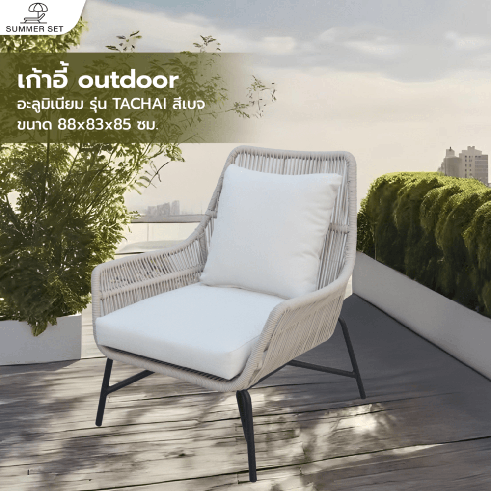 SUMMER SET รุ่น TACHAI มาใน โทนสีเบจ (Beige) ที่ให้ความรู้สึกอบอุ่น หรูหรา และเข้ากับทุกสไตล์ของการตกแต่ง เหมาะสำหรับทั้งพื้นที่กลางแจ้งและภายในอาคาร สามารถจัดวางร่วมกับโต๊ะกลางเพื่อสร้างบรรยากาศที่กลมกลืนและสวยงาม