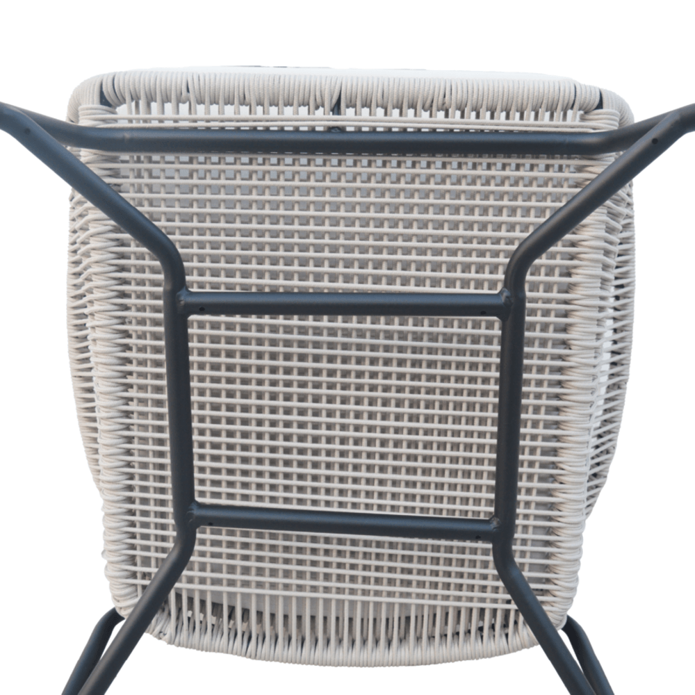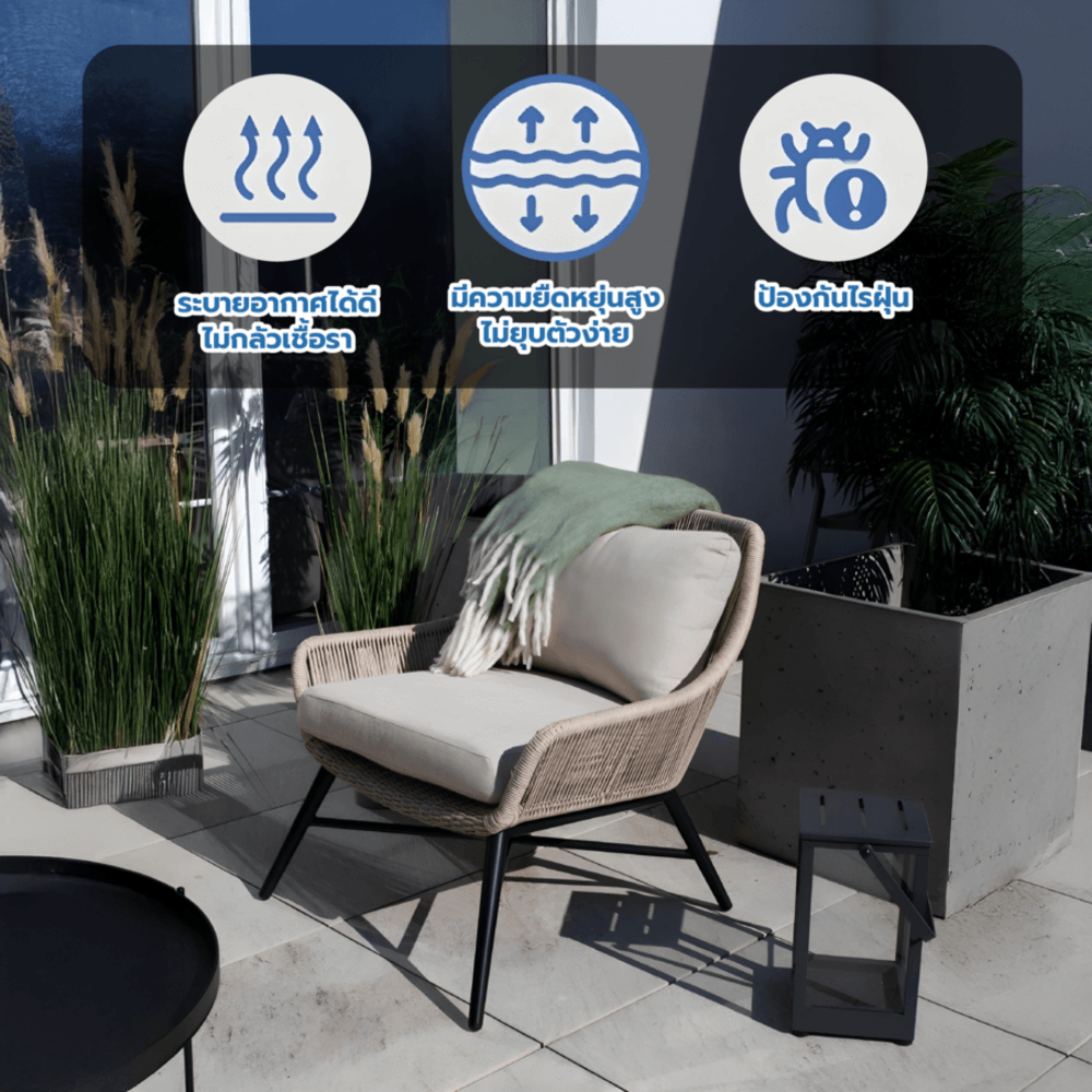 พนักพิงและที่วางแขนใช้ Olifen Belt Weaving ขนาด 4-6 มม. ซึ่งเป็นเส้นใยสังเคราะห์คุณภาพสูง ทนทานต่อรังสียูวี ไม่ซีดจางง่าย ให้สัมผัสที่นุ่มนวลและรองรับสรีระได้ดี