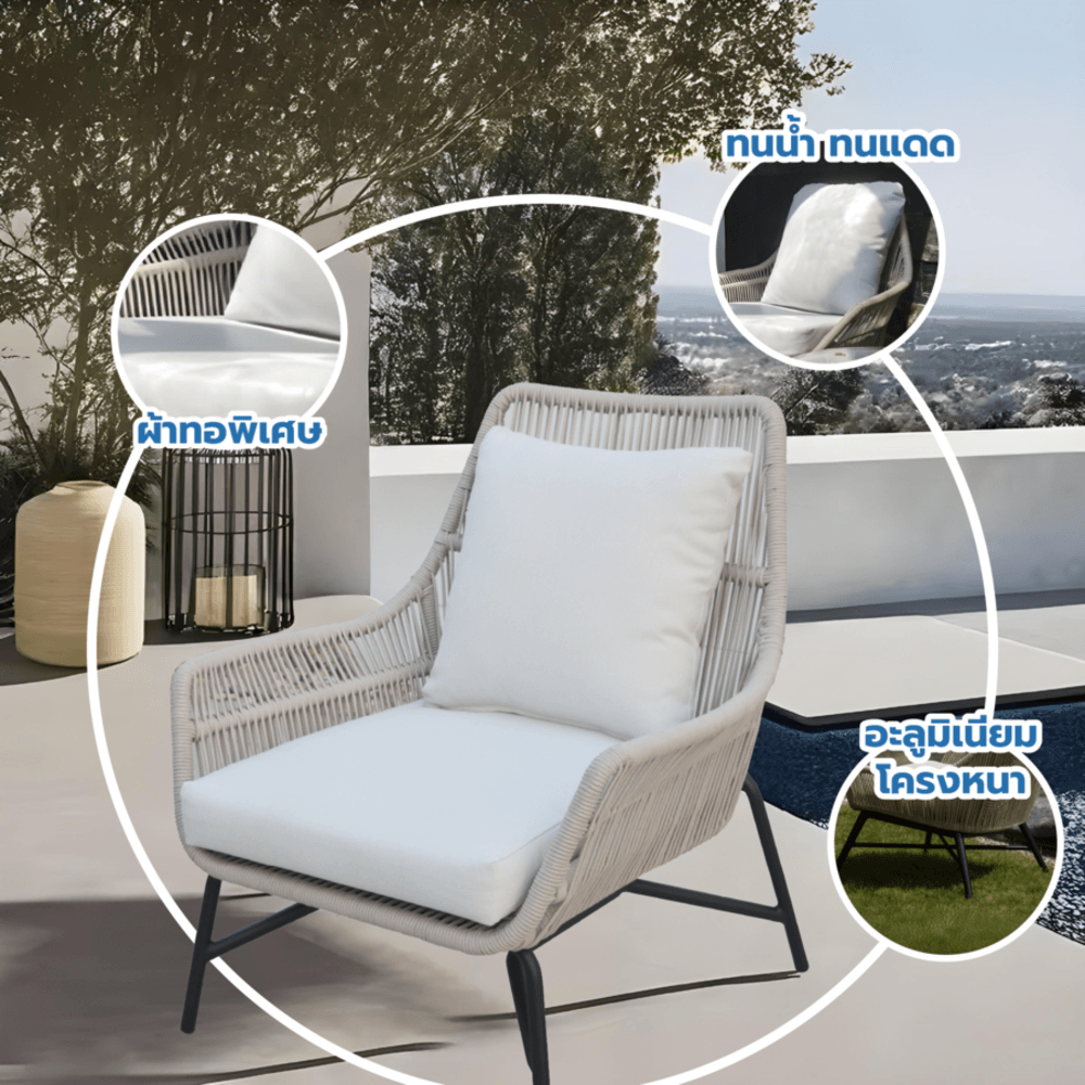 เป็นเก้าอี้ Outdoor ที่ออกแบบมาอย่างประณีต เพื่อตอบสนองการใช้งานทั้งภายในและภายนอกอาคาร ด้วยโครงสร้างที่แข็งแรง ทนทาน และการออกแบบที่ทันสมัย ช่วยเพิ่มบรรยากาศหรูหราให้กับพื้นที่พักผ่อน ไม่ว่าจะเป็นสวน ระเบียง ริมสระน้ำ หรือพื้นที่นั่งเล่น