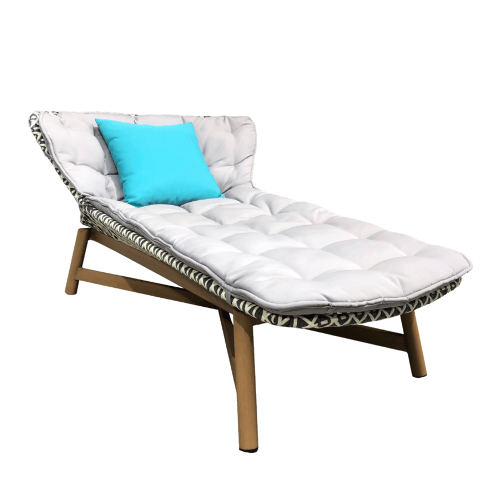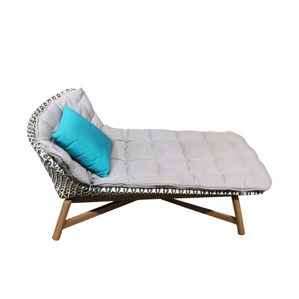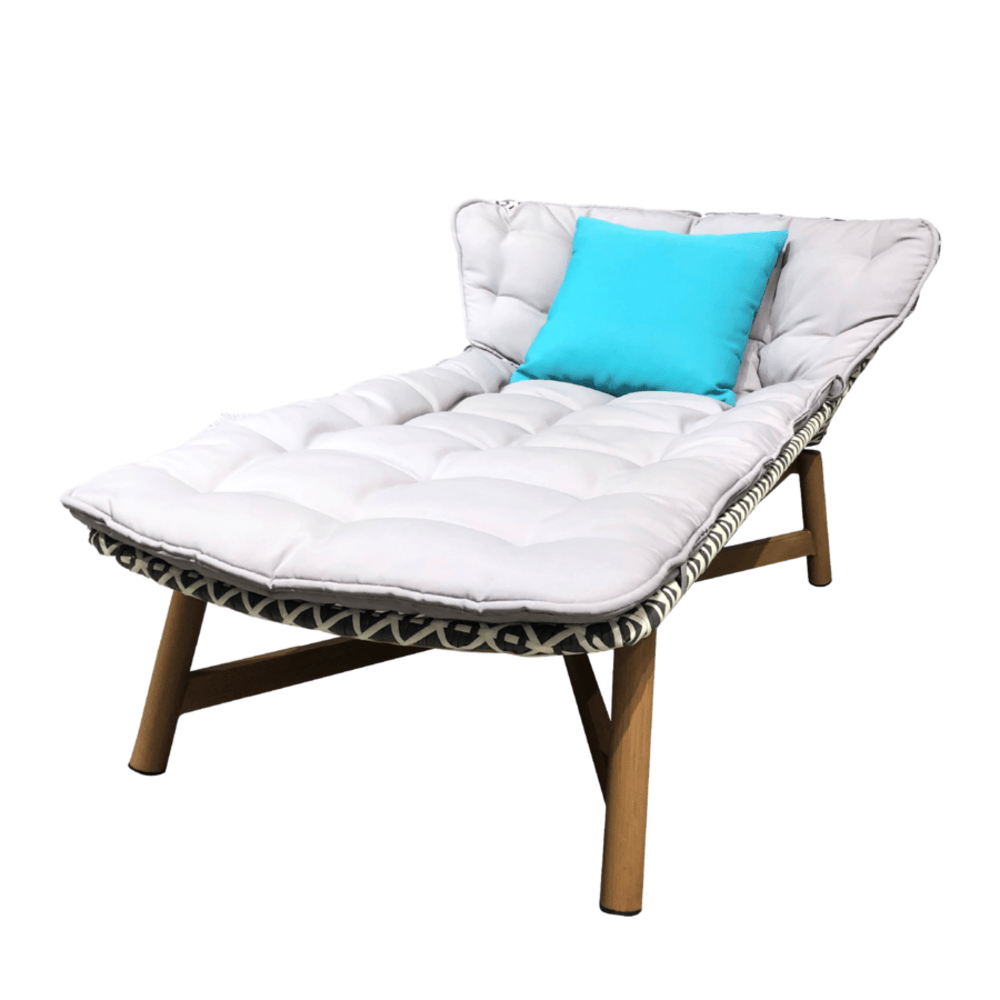 พื้นเตียงใช้การสานด้วย PE Rattan ซึ่งเป็นวัสดุสังเคราะห์ที่มีความแข็งแรง ทนทานต่อรังสี UV และไม่แตกหักง่าย ทำให้เตียงรุ่นนี้เหมาะสำหรับใช้งานกลางแจ้งอย่างแท้จริง ผิวสัมผัสของ PE Rattan ให้ความรู้สึกอบอุ่นและเป็นธรรมชาติในสไตล์เฟอร์นิเจอร์หวายที่นิยมใช้ในสวนหรือริมสระ