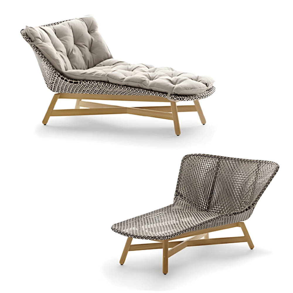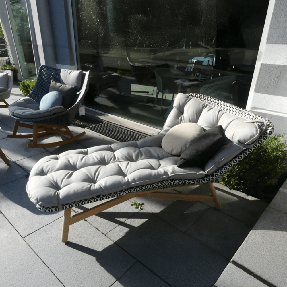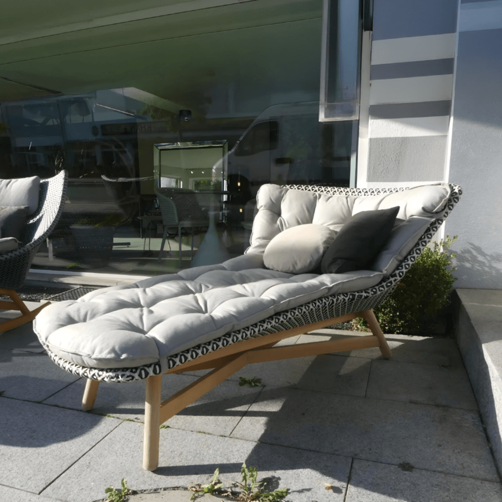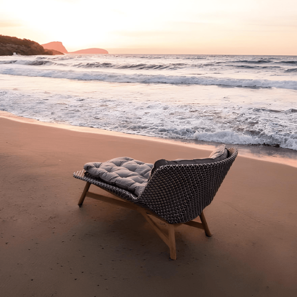 พื้นเตียงใช้การสานด้วย PE Rattan ซึ่งเป็นวัสดุสังเคราะห์ที่มีความแข็งแรง ทนทานต่อรังสี UV และไม่แตกหักง่าย ทำให้เตียงรุ่นนี้เหมาะสำหรับใช้งานกลางแจ้งอย่างแท้จริง ผิวสัมผัสของ PE Rattan ให้ความรู้สึกอบอุ่นและเป็นธรรมชาติในสไตล์เฟอร์นิเจอร์หวายที่นิยมใช้ในสวนหรือริมสระ
