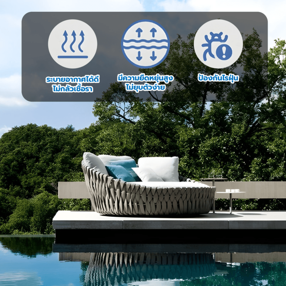 อีกหนึ่งจุดเด่นของรุ่น Andaman คือดีไซน์พนักพิงและที่วางแขนที่ถักด้วยเชือกคุณภาพสูง (Rope Weaving) ให้ลุคโมเดิร์นแบบร่วมสมัย พร้อมทั้งช่วยให้อากาศถ่ายเทได้ดี นั่งแล้วไม่รู้สึกร้อนหรืออับ เหมาะมากสำหรับใช้งานในพื้นที่กลางแจ้ง