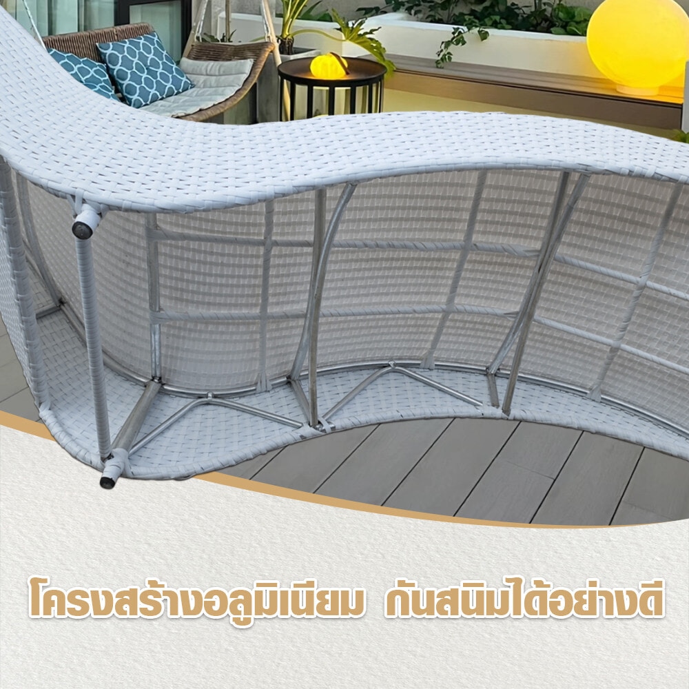 วัสดุหลัก: โครงอลูมิเนียม (Aluminium) แข็งแรง ไม่เป็นสนิม หุ้มด้วยหวายเทียม (PE Rattan) คุณภาพสูง ทนรังสี UV ไม่ซีดจางง่ายแม้ใช้งานกลางแดด