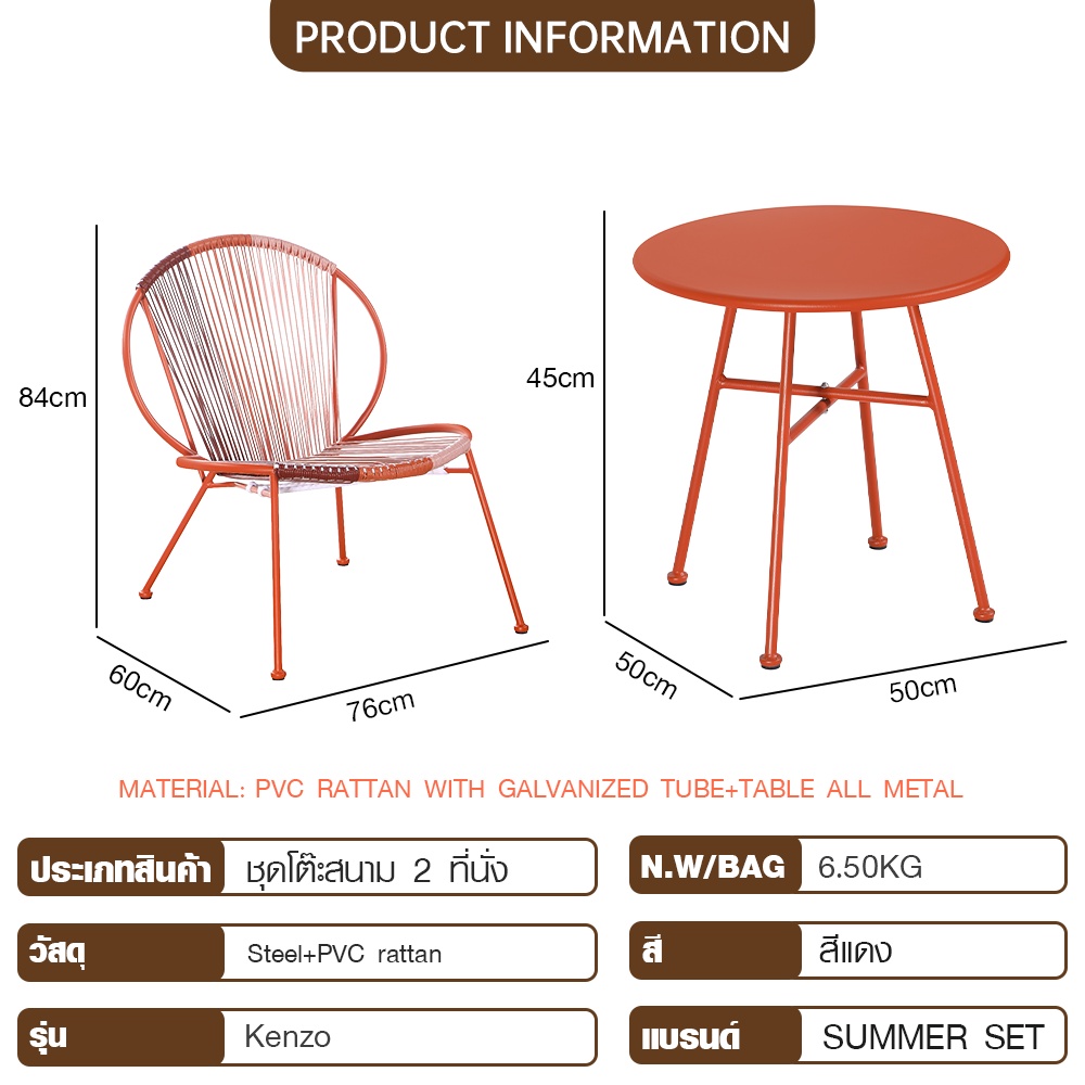 SUMMER SET ชุดโต๊ะสนาม 2 ที่นั่ง รุ่น Kenzo ขนาด โต๊ะ: 50x50x45 ซม.ขนาดเก้าอี้: 70x60x84 ซม. สีแดง