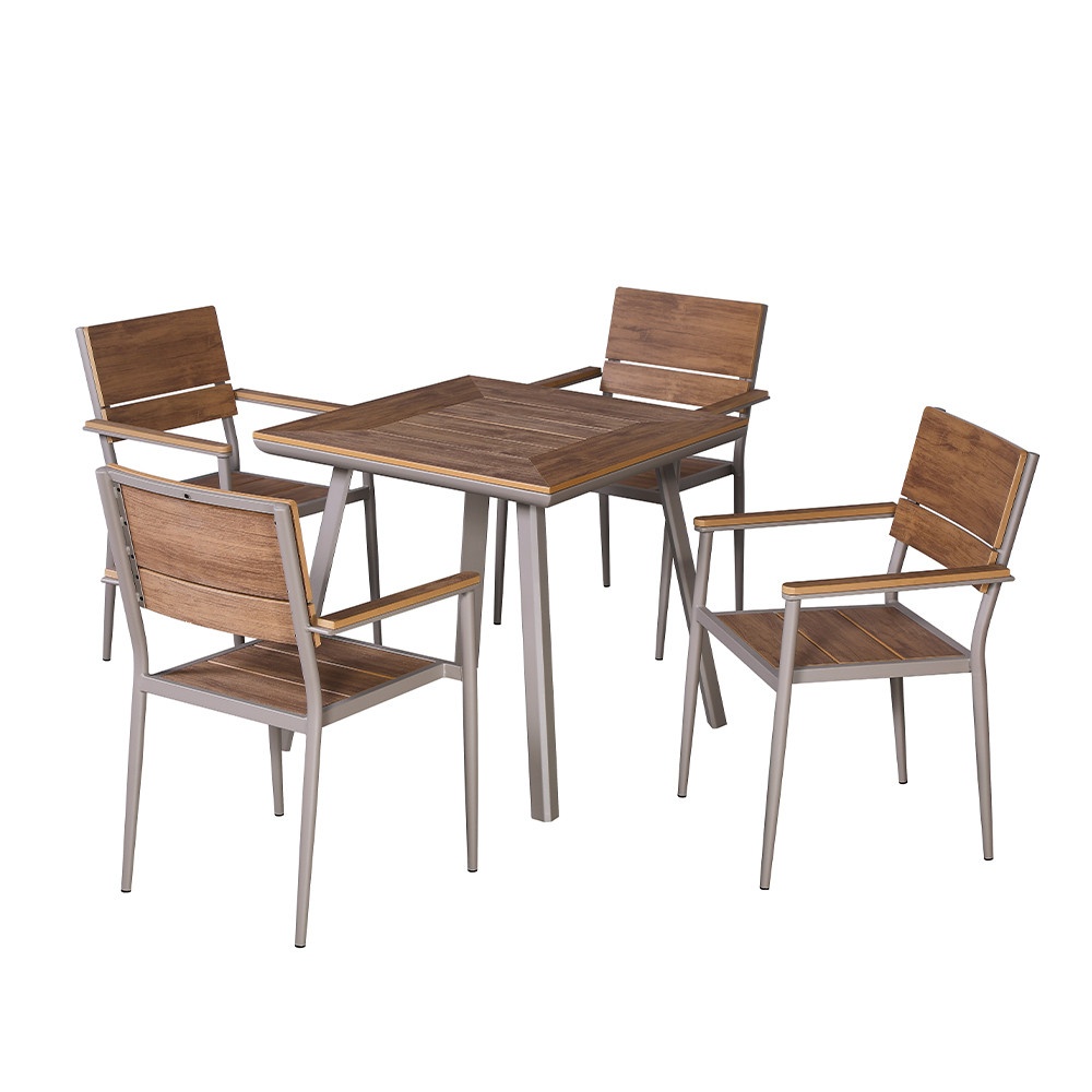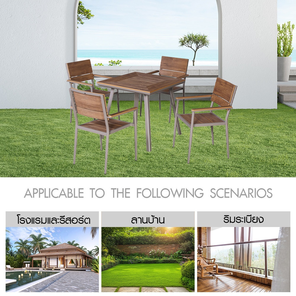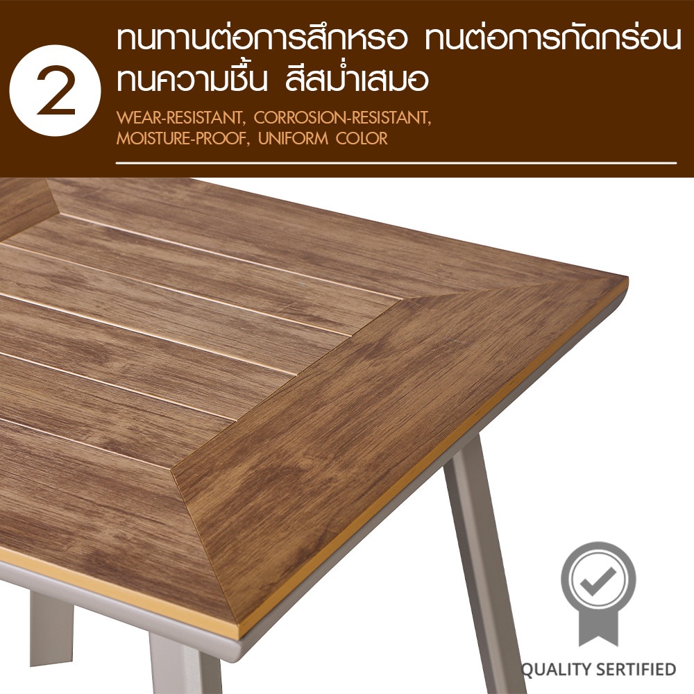 วัสดุ: โครงเหล็กแข็งแรง + แผ่นไม้สังเคราะห์ (Polywood) ทนแดดฝน ไม่ผุ ไม่บวม ดูเหมือนไม้จริง แต่ดูแลง่ายกว่า