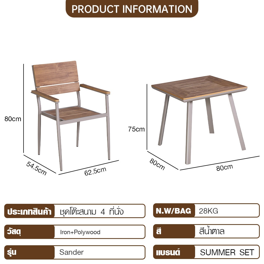 SUMMER SETชุดโต๊ะสนาม 4 ที่นั่ง รุ่น Sander ขนาด โต๊ะ: 80x80x75 ซม. เก้าอี้ : 54.5x62.5x80ซม. สีน้ำตาล