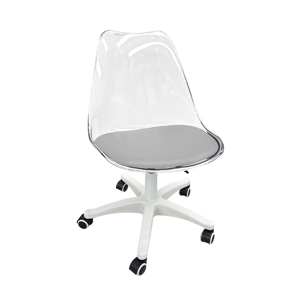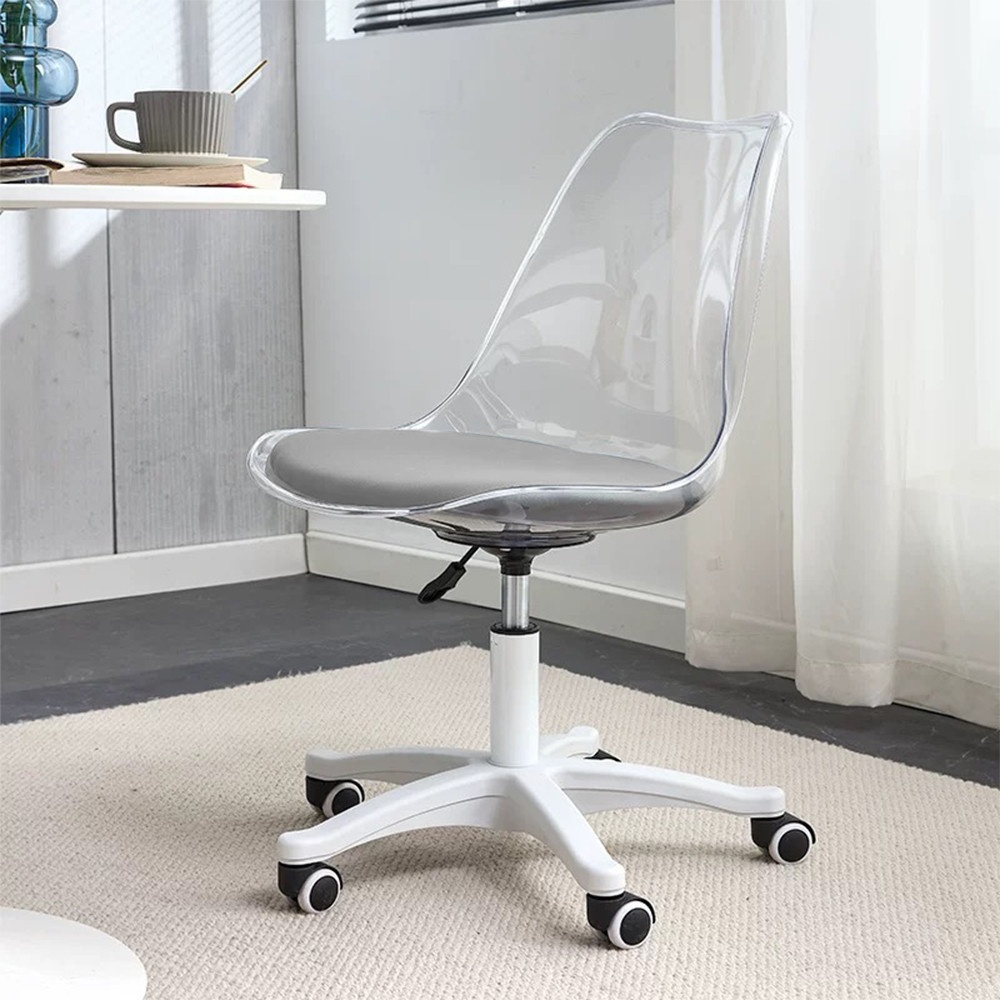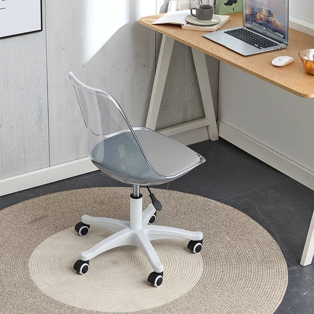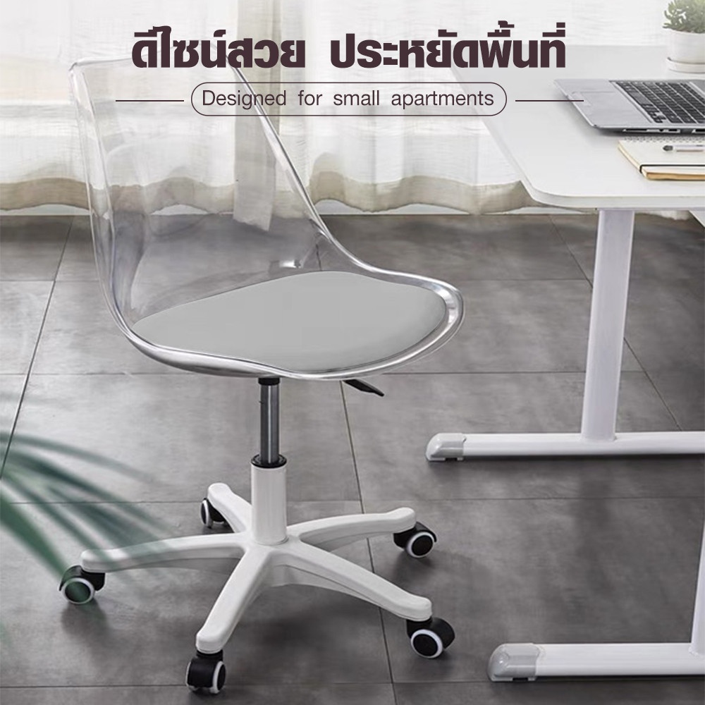 ตัวเก้าอี้ออกแบบด้วยพลาสติกโปร่งใส ผสมผสานสีดำและขาว ดูโมเดิร์น เหมาะกับห้องทำงานยุคใหม่