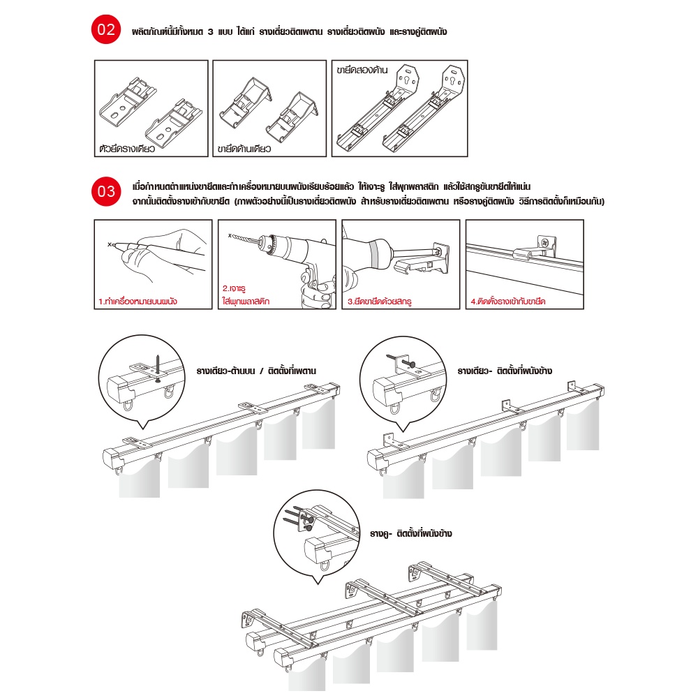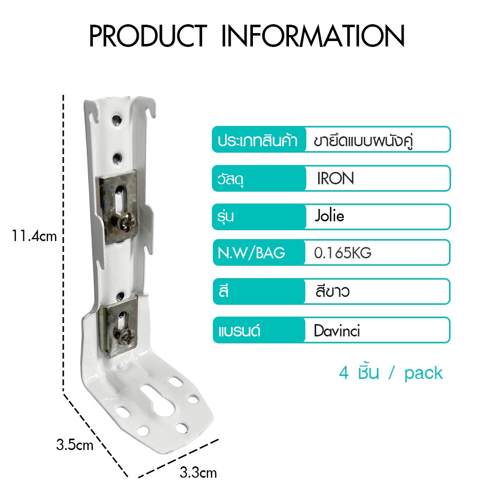 เพื่อให้การติดตั้งระบบผ้าม่านสองชั้นของคุณเป็นไปอย่างสมบูรณ์แบบและแข็งแรงที่สุด DAVINCI ขายึดแบบผนังคู่รุ่น Jolie จึงมาในรูปแบบ แพ็ค 4 ชิ้น (wall double bracket *4pcs) ถือว่าเพียงพอและเหมาะสมอย่างยิ่งสำหรับการติดตั้งรางผ้าม่านสองชั้นขนาดมาตรฐานทั่วไป (เช่น รางแบบยืดหด 100-180 ซม. หรือ 120-210 ซม.) ได้อย่างมั่นคงและปลอดภัย การใช้ขายึดจำนวนที่เหมาะสมจะช่วยกระจายน้ำหนักของรางและผ้าม่านได้อย่างทั่วถึง ลดความเสี่ยงที่รางจะหย่อนคล้อย