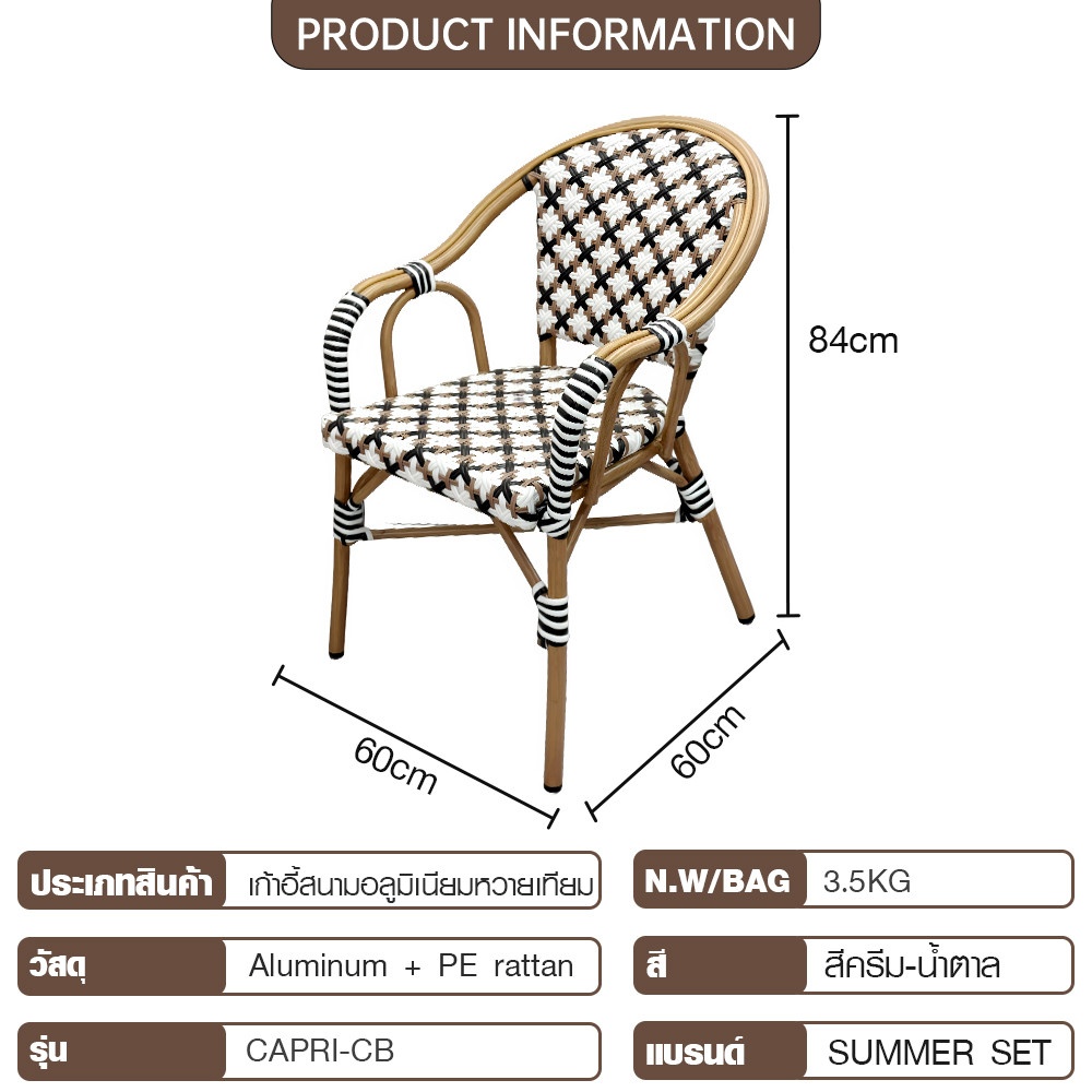 SUMMER SET เก้าอี้สนาม รุ่น CAPRI-CB ได้รับการออกแบบภายใต้แนวคิด "Outdoor Comfort & Style" ที่ผสมผสานความสวยงามแบบธรรมชาติเข้ากับความทนทานของวัสดุสมัยใหม่ค่ะ ขนาดที่กะทัดรัดแต่กว้างขวางพอเหมาะที่ 60x60x84 ซม. ทำให้เก้าอี้รุ่นนี้สามารถจัดวางได้อย่างลงตัวในทุกพื้นที่ ไม่ว่าจะเป็นมุมเล็กๆ บนระเบียงคอนโด หรือจะจัดวางเป็นชุดในสวนขนาดใหญ่ ก็สามารถสร้างบรรยากาศที่อบอุ่นและเชื้อเชิญให้เข้ามาใช้งานได้เป็นอย่างดีค่ะ