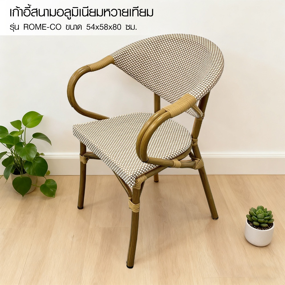 SUMMER SET เก้าอี้สนาม รุ่น ROME-CO มาในขนาดที่กะทัดรัดแต่กว้างขวางพอเหมาะที่ 54x58x80 ซม. ทำให้เก้าอี้รุ่นนี้สามารถจัดวางได้อย่างลงตัวในทุกพื้นที่ ไม่ว่าจะเป็นมุมเล็กๆ บนระเบียงคอนโด หรือจะจัดวางเป็นชุดในสวนขนาดใหญ่ ก็สามารถสร้างบรรยากาศที่อบอุ่นและเชื้อเชิญให้เข้ามาใช้งานได้เป็นอย่างดี