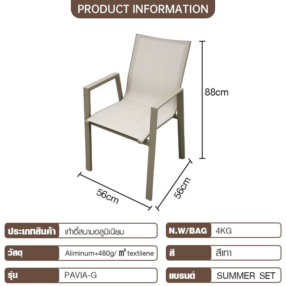 SUMMER SET เก้าอี้ Outdoor รุ่น PAVIA-G ดีไซน์ของเก้าอี้รุ่นนี้สะท้อนถึงความสง่างามและความผ่อนคลายในเวลาเดียวกันค่ะ ขนาดที่กะทัดรัดแต่กว้างขวางพอเหมาะที่ 56x56x88 ซม. ทำให้เก้าอี้รุ่นนี้สามารถจัดวางได้อย่างลงตัวในทุกพื้นที่ ไม่ว่าจะเป็นมุมเล็กๆ บนระเบียงคอนโด หรือจะจัดวางเป็นชุดในสวนขนาดใหญ่ ก็สามารถสร้างบรรยากาศที่อบอุ่นและเชื้อเชิญให้เข้ามาใช้งานได้เป็นอย่างดี