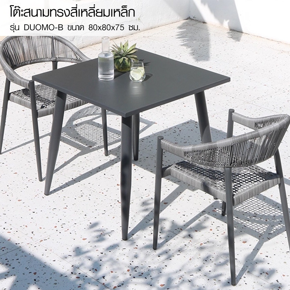 SUMMER SET โต๊ะสนาม รุ่น DUOMO-B ด้วยขนาดที่กะทัดรัดแต่ใช้งานได้จริงที่ กว้าง 80 ซม. ลึก 80 ซม. และสูง 75 ซม. โต๊ะทรงสี่เหลี่ยมรุ่นนี้จึงเหมาะอย่างยิ่งสำหรับเป็นโต๊ะอาหารกลางแจ้งสำหรับ 2-4 ที่นั่ง หรือเป็นโต๊ะเสริมสำหรับวางเครื่องดื่ม ขนม และของตกแต่งในมุมพักผ่อน รูปทรงสี่เหลี่ยมยังช่วยให้ง่ายต่อการจัดวางชิดผนังหรือมุมห้อง ช่วยประหยัดพื้นที่ได้อย่างมีประสิทธิภาพ สร้างบรรยากาศที่อบอุ่นและเป็นกันเองในทุกมื้ออาหารหรือทุกช่วงเวลาพักผ่อน