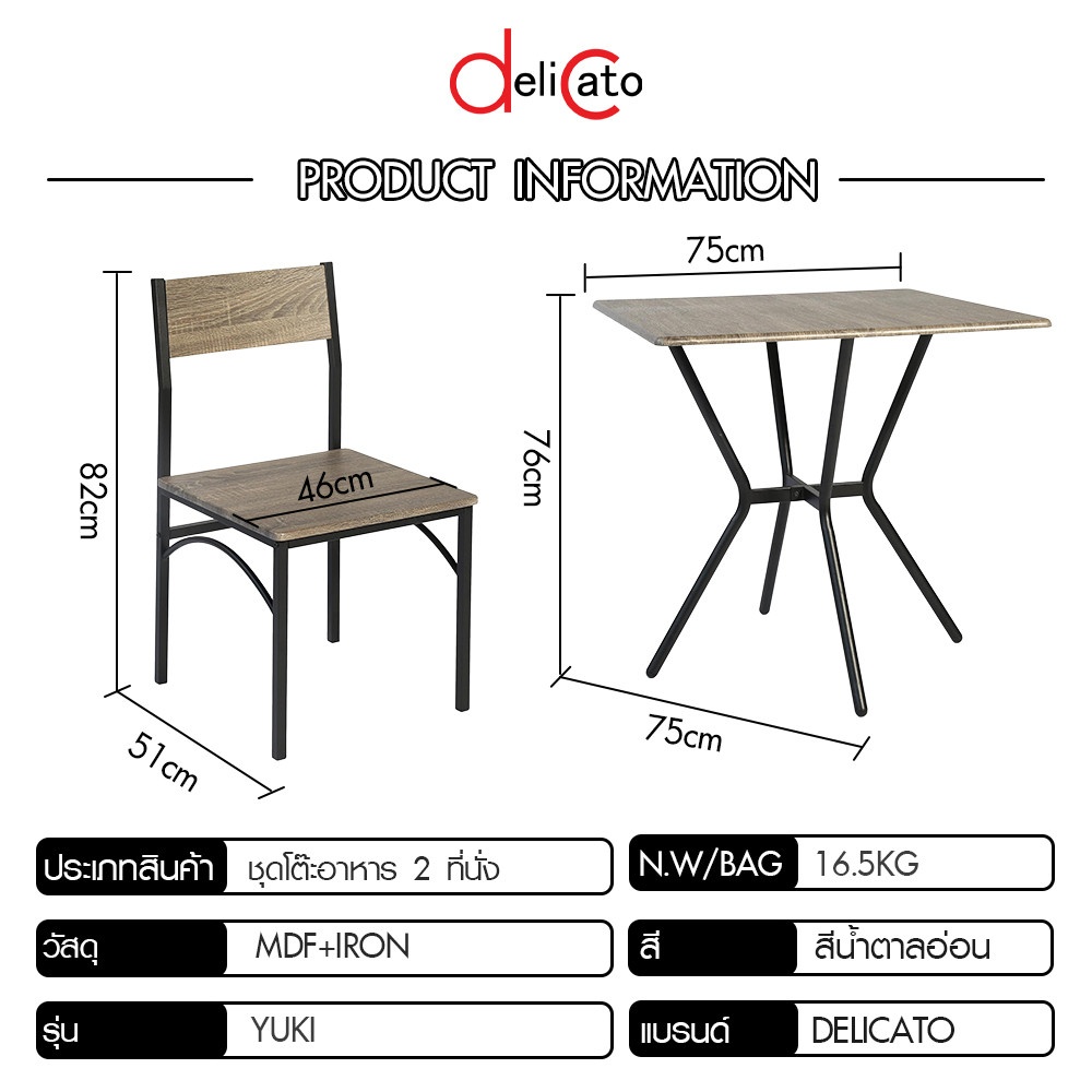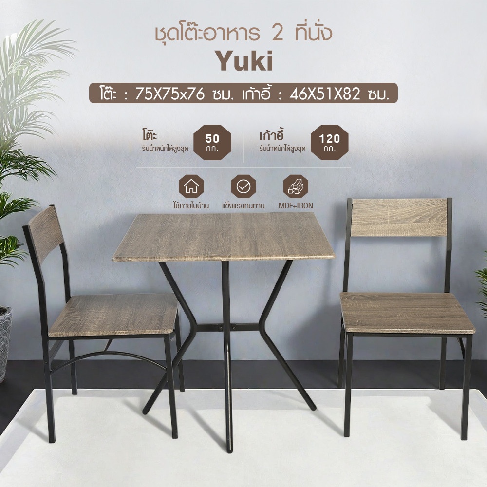 Delicato ชุดโต๊ะอาหาร 2 ที่นั่ง รุ่น Yuki โต๊ะ:75X75x76 ซม. เก้าอี้:46X51X82ซม. สีน้ำตาลอ่อน