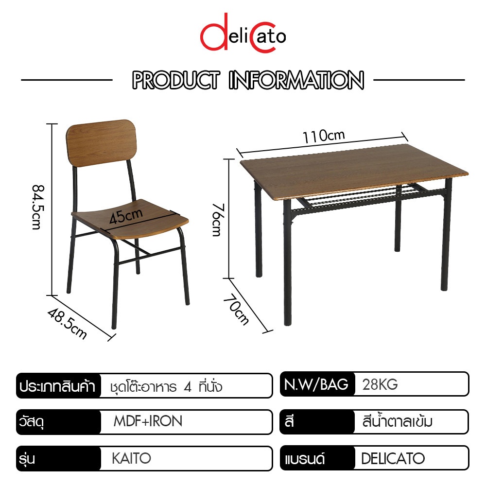 Delicato ชุดโต๊ะอาหาร 4 ที่นั่ง รุ่น Kaito โต๊ะ:110X70X76ซม. เก้าอี้:45x48.5x84.5ซม. สีน้ำตาลเข้ม