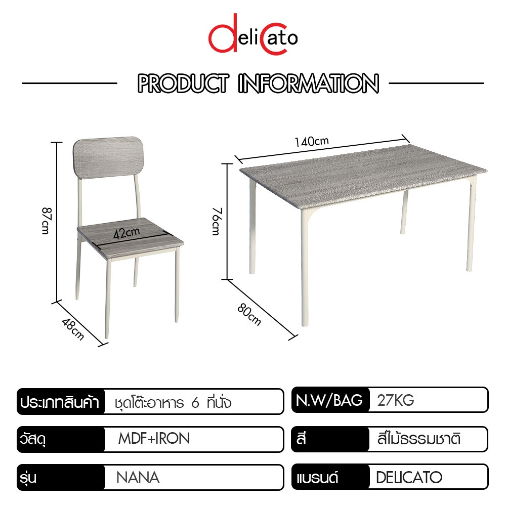 ประเภท: ชุดโต๊ะอาหาร 1 โต๊ะ + 6 เก้าอี้
