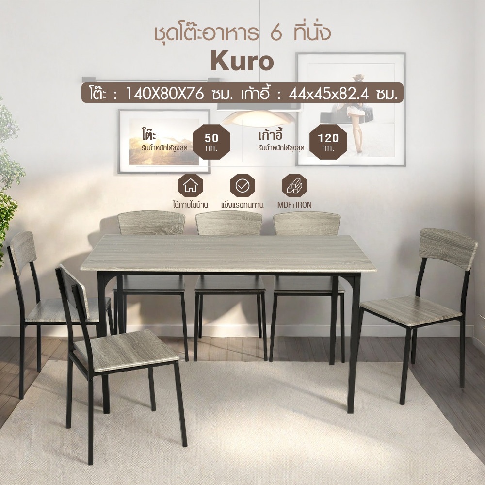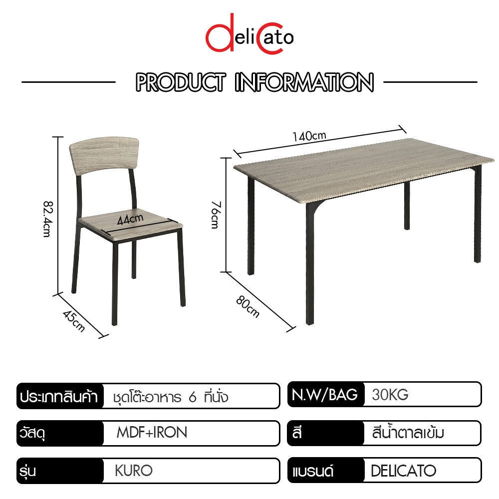 Delicato ชุดโต๊ะอาหาร 6 ที่นั่ง รุ่น Kuro โต๊ะ:140X80X76ซม. เก้าอี้:44x45x82.4ซม. สีน้ำตาลเข้ม
