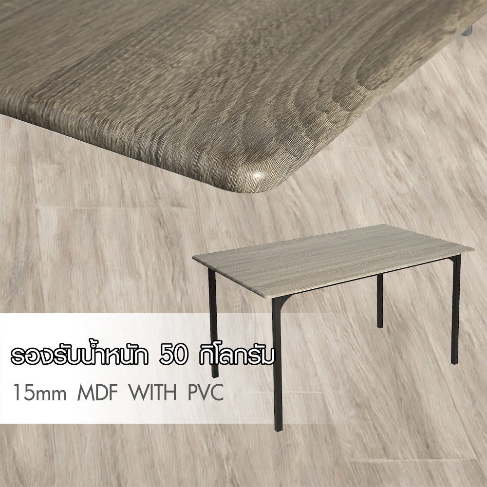 โต๊ะอาหาร ขนาด 140x80x76 ซม. พื้นโต๊ะทำจาก MDF หนา 15 มม. เคลือบ PVC ช่วยให้ทนต่อรอยขีดข่วน กันน้ำ และทำความสะอาดง่าย