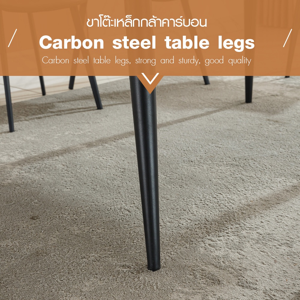 ผสานความแข็งแกร่งและดีไซน์ที่หรูหราด้วย ขาโต๊ะที่ผลิตจากเหล็กคาร์บอน (Carbon Steel) ซึ่งเป็นวัสดุที่ขึ้นชื่อเรื่องความแข็งแรงทนทานเป็นพิเศษ สามารถรับน้ำหนักได้ดีเยี่ยม มีความมั่นคงสูง และให้รูปลักษณ์ที่ดูทันสมัย มินิมอล ขาโต๊ะเหล็กคาร์บอนดีไซน์เรียบง่ายแต่แข็งแกร่งนี้ ไม่เพียงช่วยเสริมความมั่นคงให้กับโต๊ะอาหาร แต่ยังให้ความรู้สึกที่โปร่งสบายตา เหมาะกับการตกแต่งภายในที่เน้นความโล่งและสะอาดตาได้อย่างสมบูรณ์แบบค่ะ ด้วยความแข็งแรงของขาโต๊ะทำให้โต๊ะอาหารรุ่นนี้สามารถ รองรับน้ำหนักได้สูงสุดถึง 100 กก.