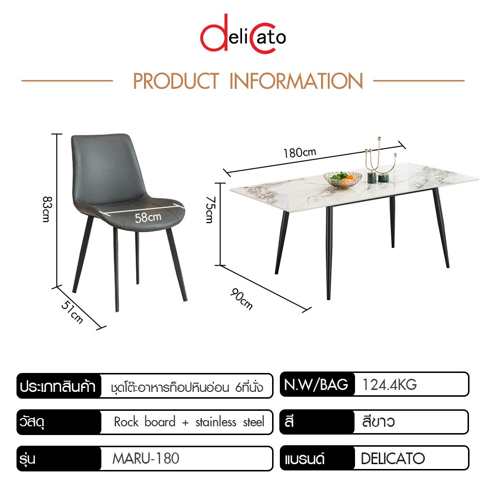 DELICATO ชุดโต๊ะอาหาร Maru-180 มาพร้อมกับขนาดโต๊ะที่กะทัดรัดแต่กว้างขวางใช้งานได้จริงถึง 90x180x75 ซม. ซึ่งเป็นขนาดที่เหมาะสมอย่างยิ่งสำหรับการใช้งานแบบ 6 ที่นั่ง ให้ทุกคนในครอบครัว หรือเพื่อนสนิทได้มาใช้เวลาร่วมกันอย่างอบอุ่นและสะดวกสบาย