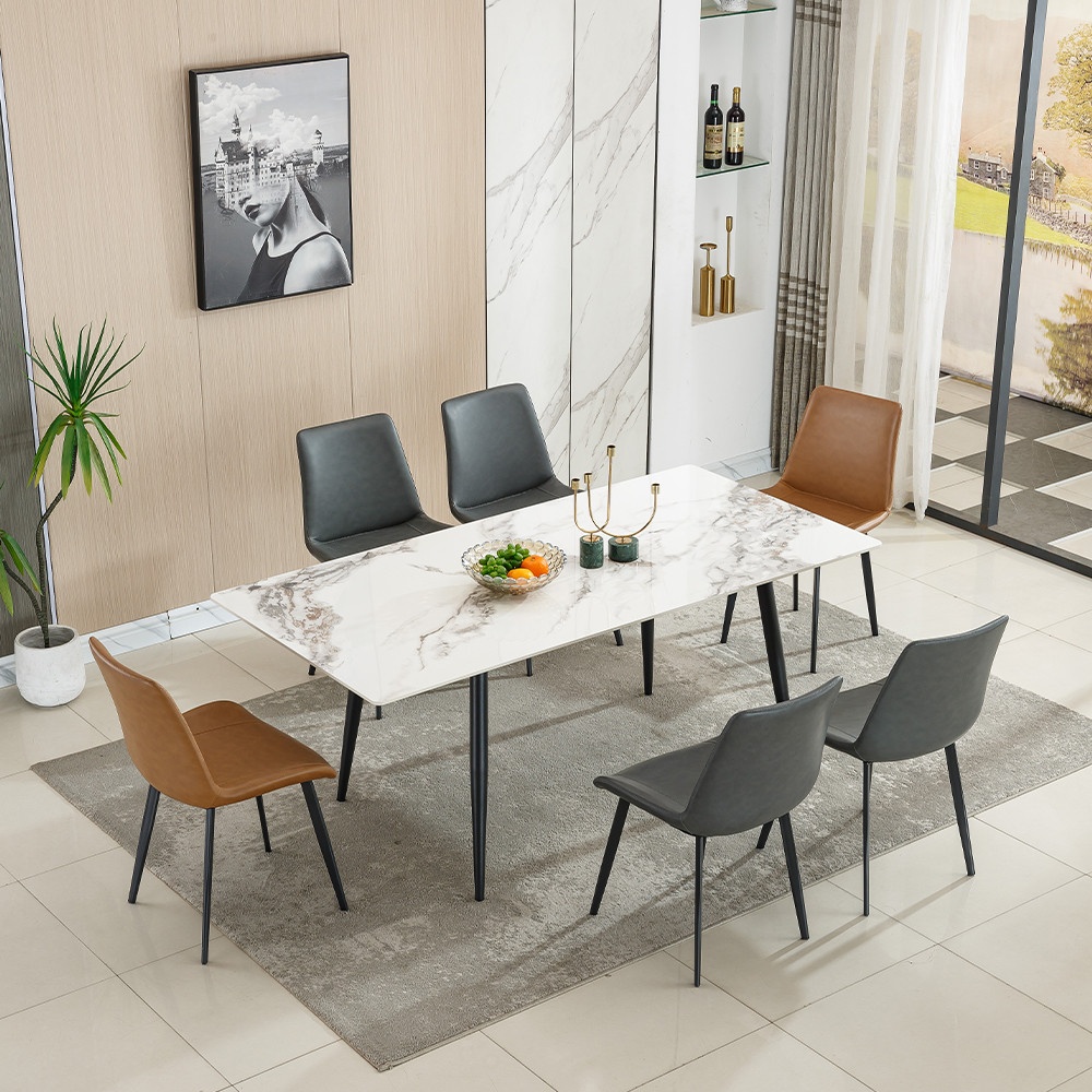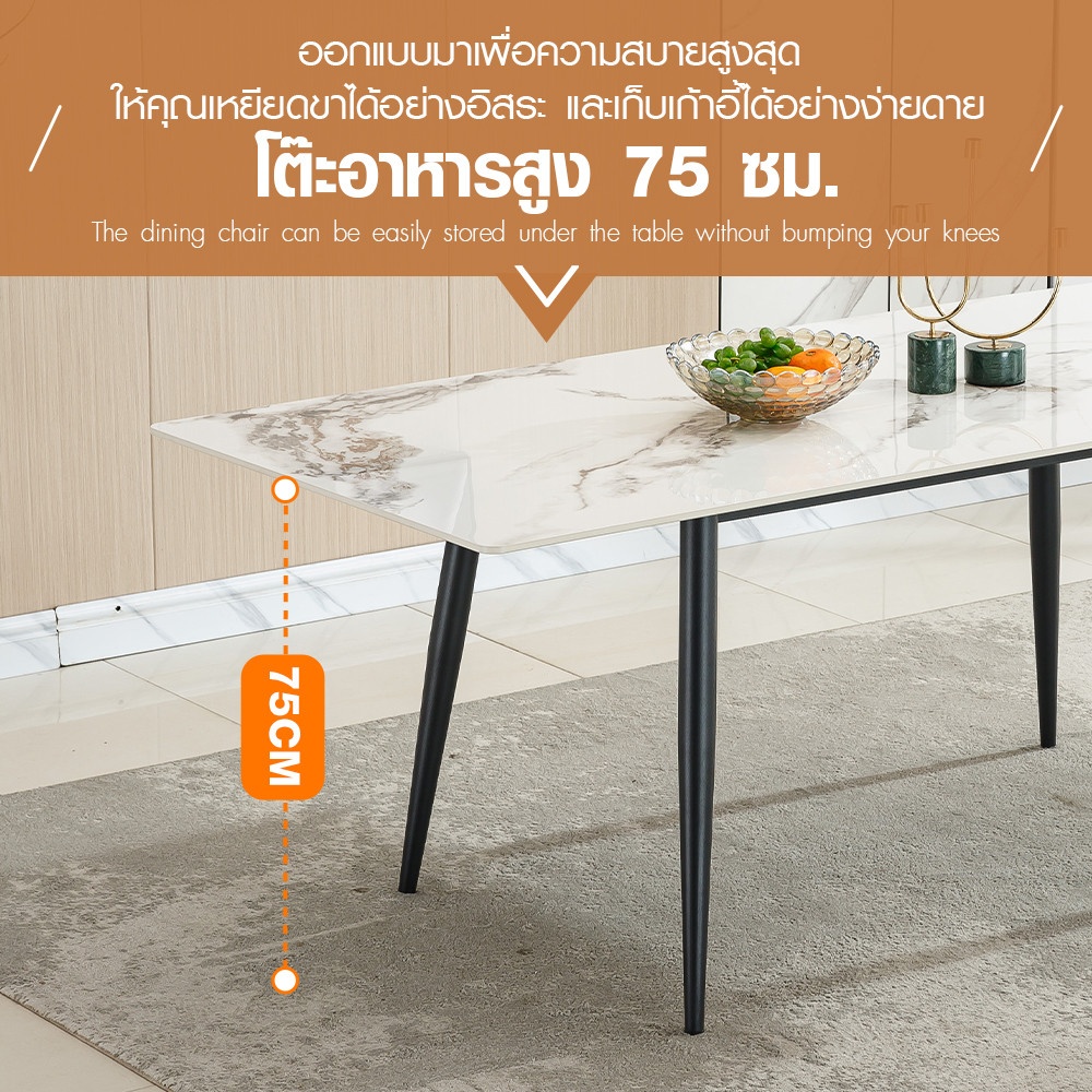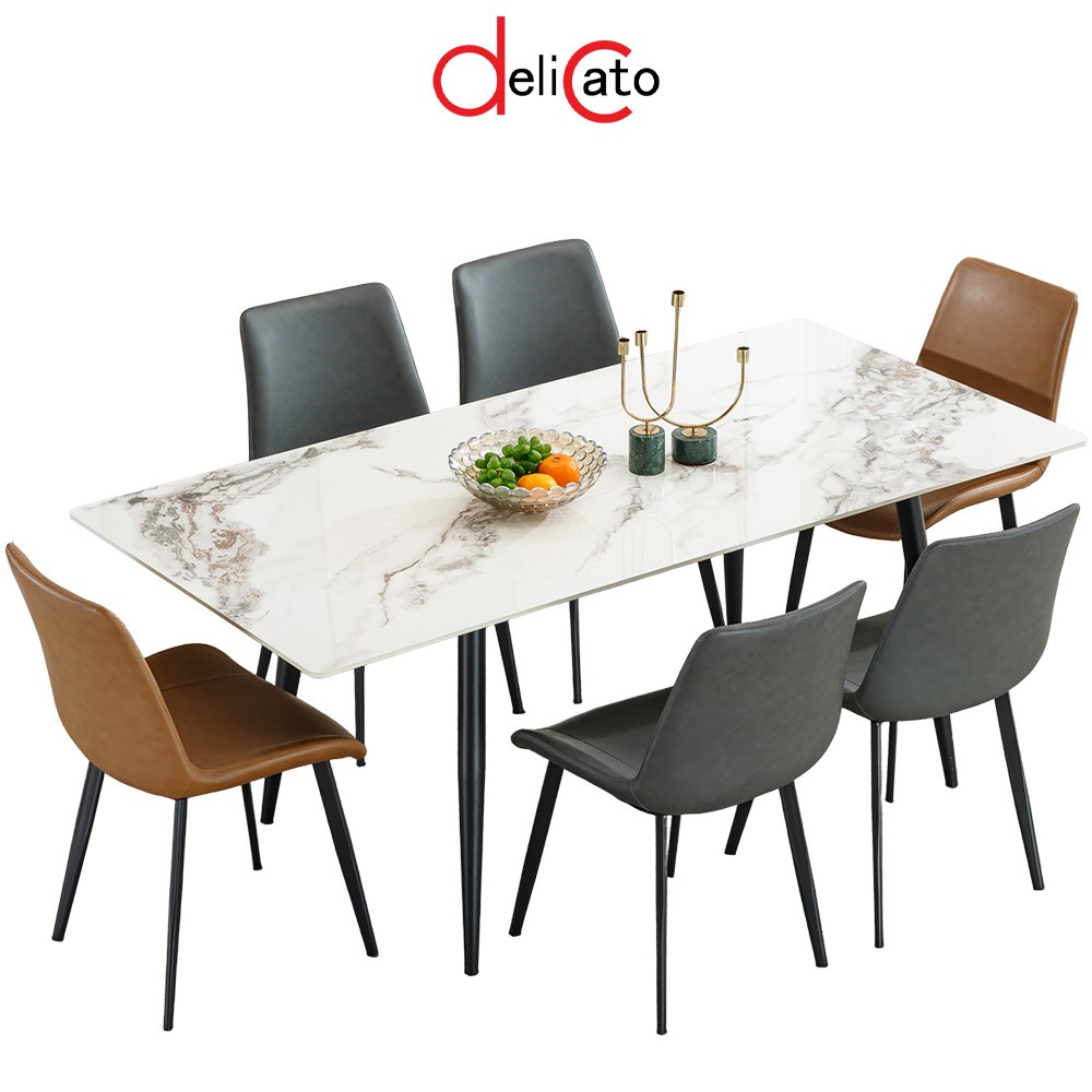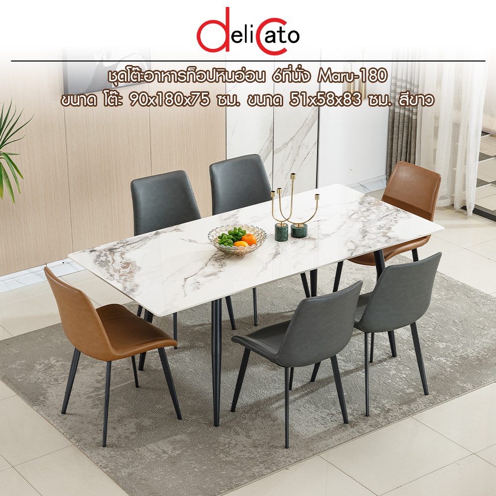 DELICATO ชุดโต๊ะอาหารท็อปลายหินอ่อน 6 ที่นั่ง รุ่น Maru-180 ขนาดโต๊ะ 90x180x75 ซม. ขนาดเก้าอี้ 51x58x83 ซม. สีขาว
