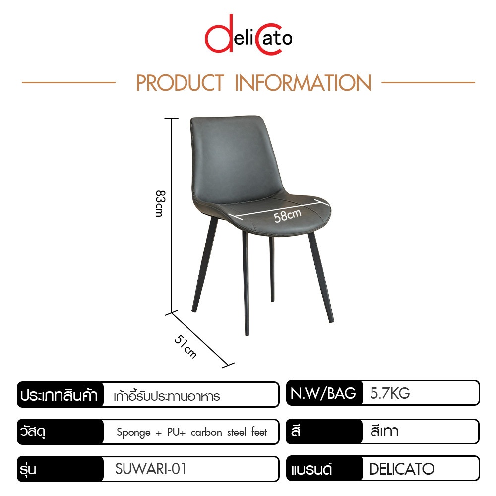 DELICATO เก้าอี้รับประทานอาหาร รุ่น Suwari-01 ถูกออกแบบมาภายใต้แนวคิด ดีไซน์โมเดิร์นที่เรียบหรูและทันสมัย โดดเด่นด้วยโทน สีเทา (Gray) ที่ดูสุขุม สง่างาม และเป็นกลาง ทำให้สามารถเข้ากันได้ดีกับชุดโต๊ะอาหารหลากหลายสไตล์ ไม่ว่าจะเป็นโต๊ะท็อปหินอ่อน ไม้ หรือแม้แต่กระจกค่ะ สีเทานี้ยังช่วยสร้างบรรยากาศที่ผ่อนคลาย แต่ยังคงไว้ซึ่งความมีรสนิยม ทำให้ห้องอาหารของคุณดูสวยงามและน่าใช้งานมากยิ่งขึ้น เหมาะสำหรับบ้านสไตล์มินิมอล, โมเดิร์น, หรือแม้แต่คอนเทมโพรารีที่ต้องการความเรียบง่ายแต่แฝงด้วยความหรูหราค่ะ