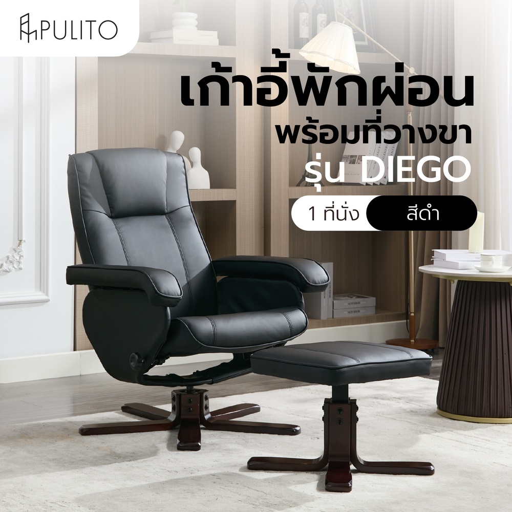 PULITO เก้าอี้พักผ่อน รุ่น DIEGO มาพร้อมดีไซน์เรียบหรู สีดำคลาสสิก โดดเด่นด้วยฟังก์ชันที่วางขาในตัว ให้คุณเอนหลังและยืดขาได้อย่างสบาย โครงสร้างแข็งแรง เบาะนั่งและพนักพิงบุหนานุ่ม รองรับสรีระอย่างลงตัว พนักพิงพิเศษโค้งรับหลัง ช่วยให้ผ่อนคลายได้เต็มที่ เหมาะสำหรับห้องนั่งเล่น มุมอ่านหนังสือ หรือมุมพักผ่อนในทุกสไตล์ของบ้าน