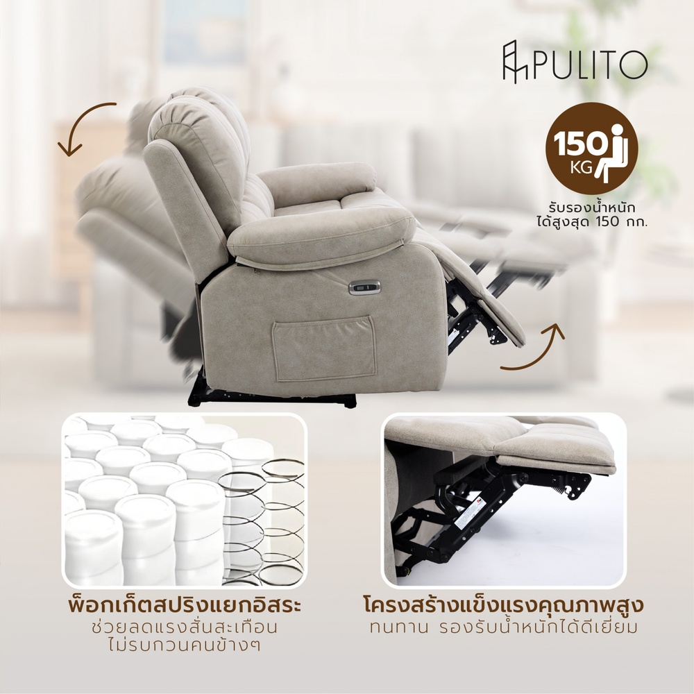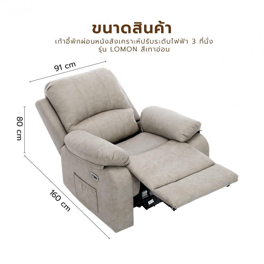 PULITO เก้าอี้พักผ่อนหนังสังเคราะห์ปรับระดับไฟฟ้า 1 ที่นั่ง รุ่น Lomon ขนาด 91x95-160x98.5-80 ซม. สีเทาอ่อน