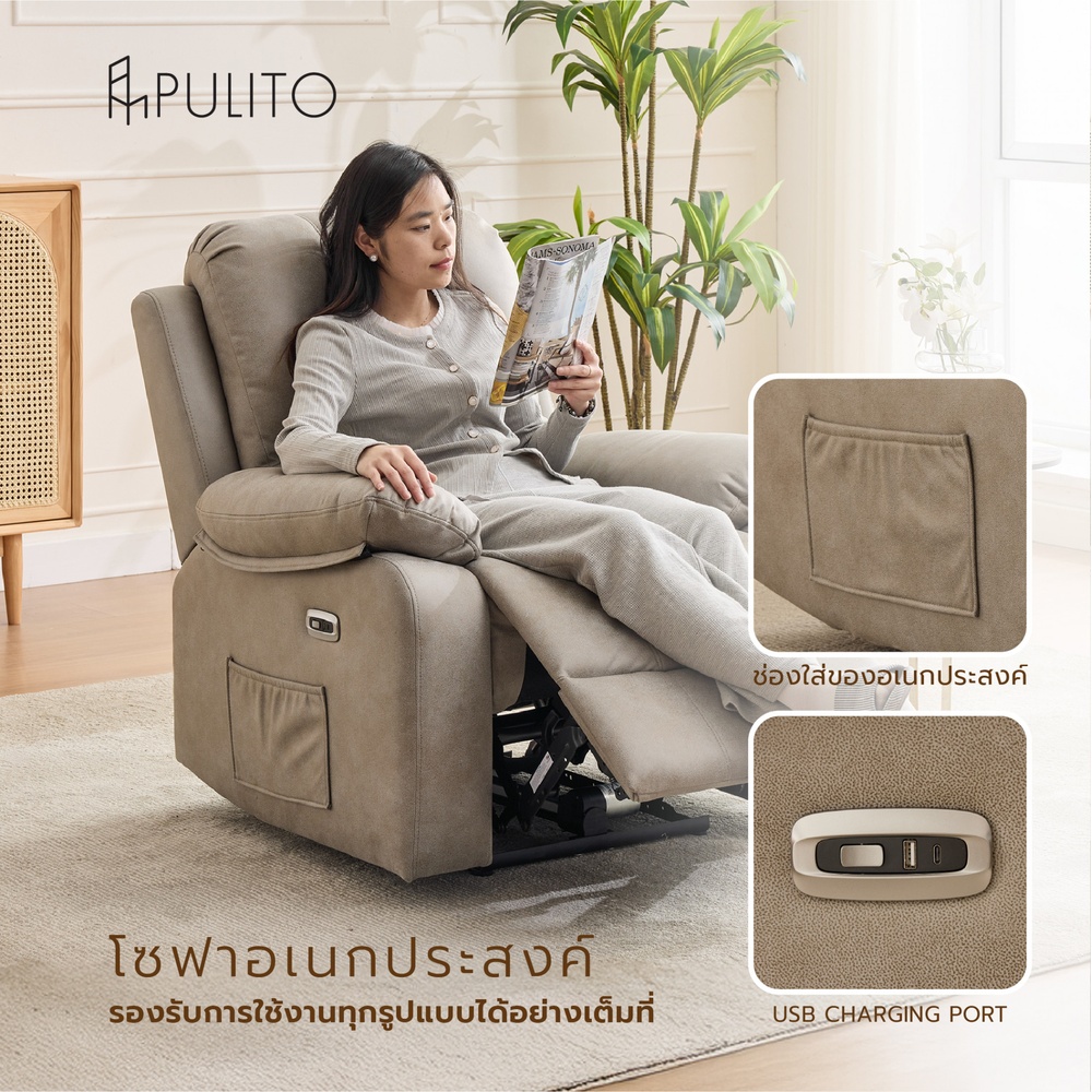 สามารถปรับระดับเอนหลังและยกที่พักขาได้ด้วยระบบไฟฟ้า ช่วยให้ผ่อนคลายกล้ามเนื้อได้ดียิ่งขึ้น เหมาะสำหรับใช้งานในห้องนั่งเล่น ห้องดูหนัง หรือมุมส่วนตัวภายในบ้าน ไม่ว่าจะดูหนัง อ่านหนังสือ หรือพักผ่อนในวันหยุด ก็ทำได้อย่างสะดวกสบาย