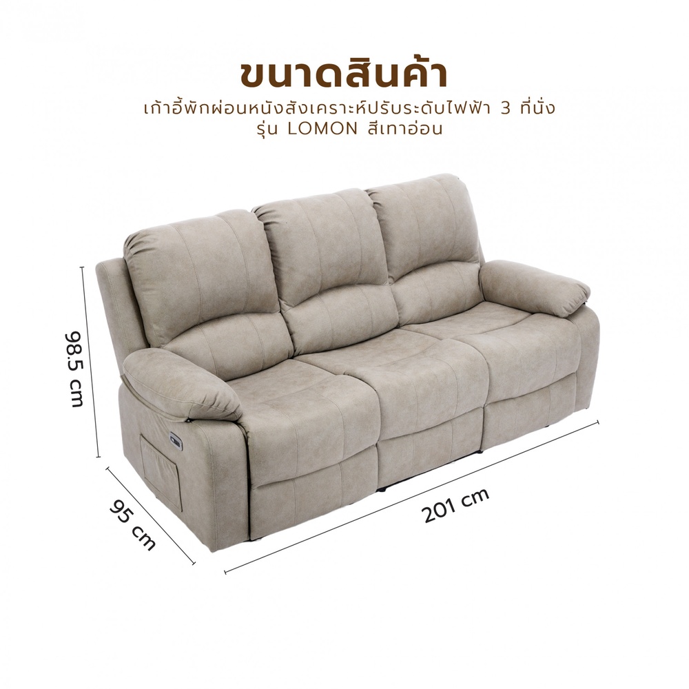 PULITO เก้าอี้พักผ่อนหนังสังเคราะห์ปรับระดับไฟฟ้า 3 ที่นั่ง รุ่น Lomon ขนาด 201x95-160x98.5-80 ซม. สีเทาอ่อน
