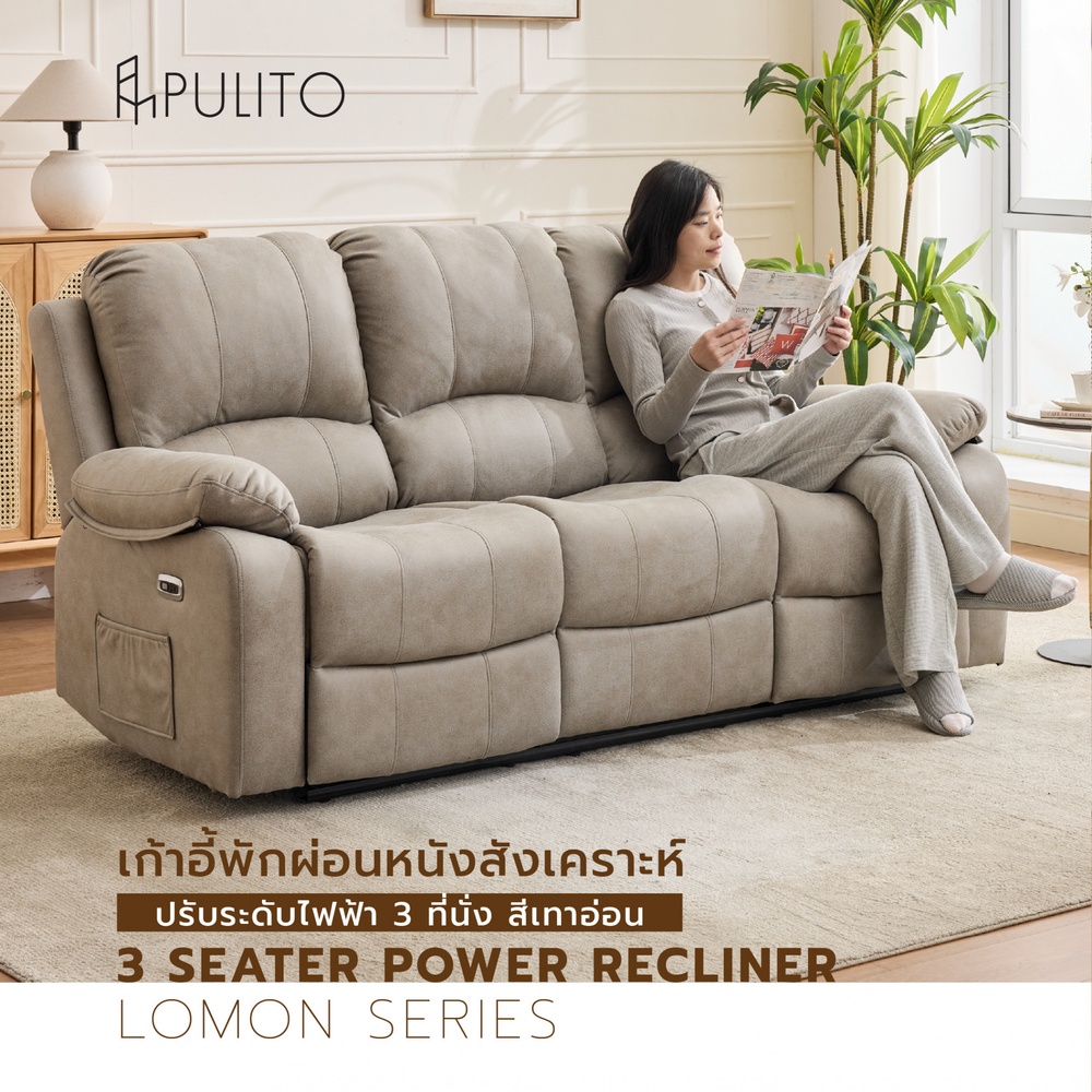 สัมผัสประสบการณ์การพักผ่อนเหนือระดับกับ PULITO รุ่น Lomon เก้าอี้พักผ่อนหนังสังเคราะห์ปรับระดับไฟฟ้าแบบ 3 ที่นั่ง ที่ออกแบบมาเพื่อเติมเต็มมุมโปรดของบ้านด้วยความสบายและความทันสมัยอย่างลงตัว มาพร้อมดีไซน์เรียบหรู สีเทาอ่อนที่ช่วยเพิ่มความอบอุ่นและสง่างามให้กับห้องนั่งเล่นหรือห้องดูหนังของคุณ