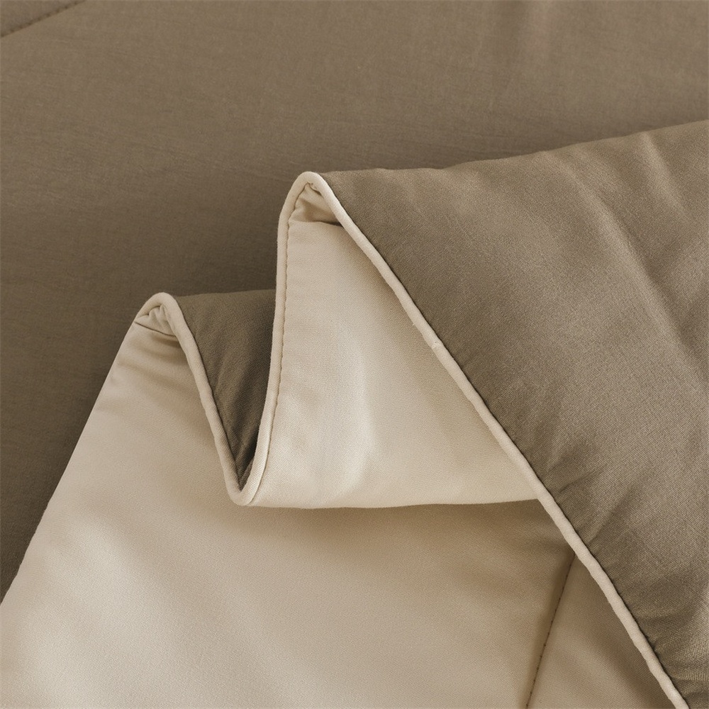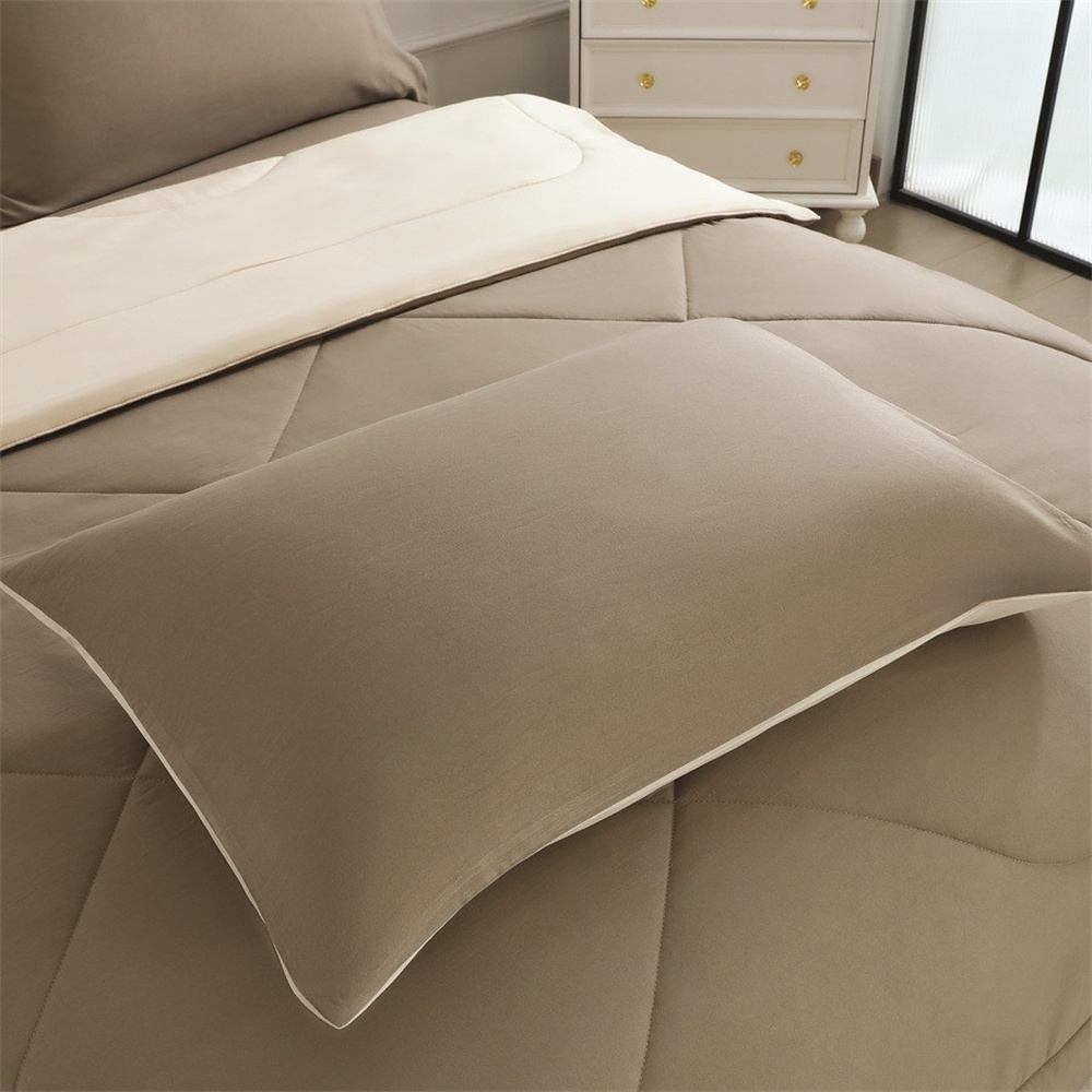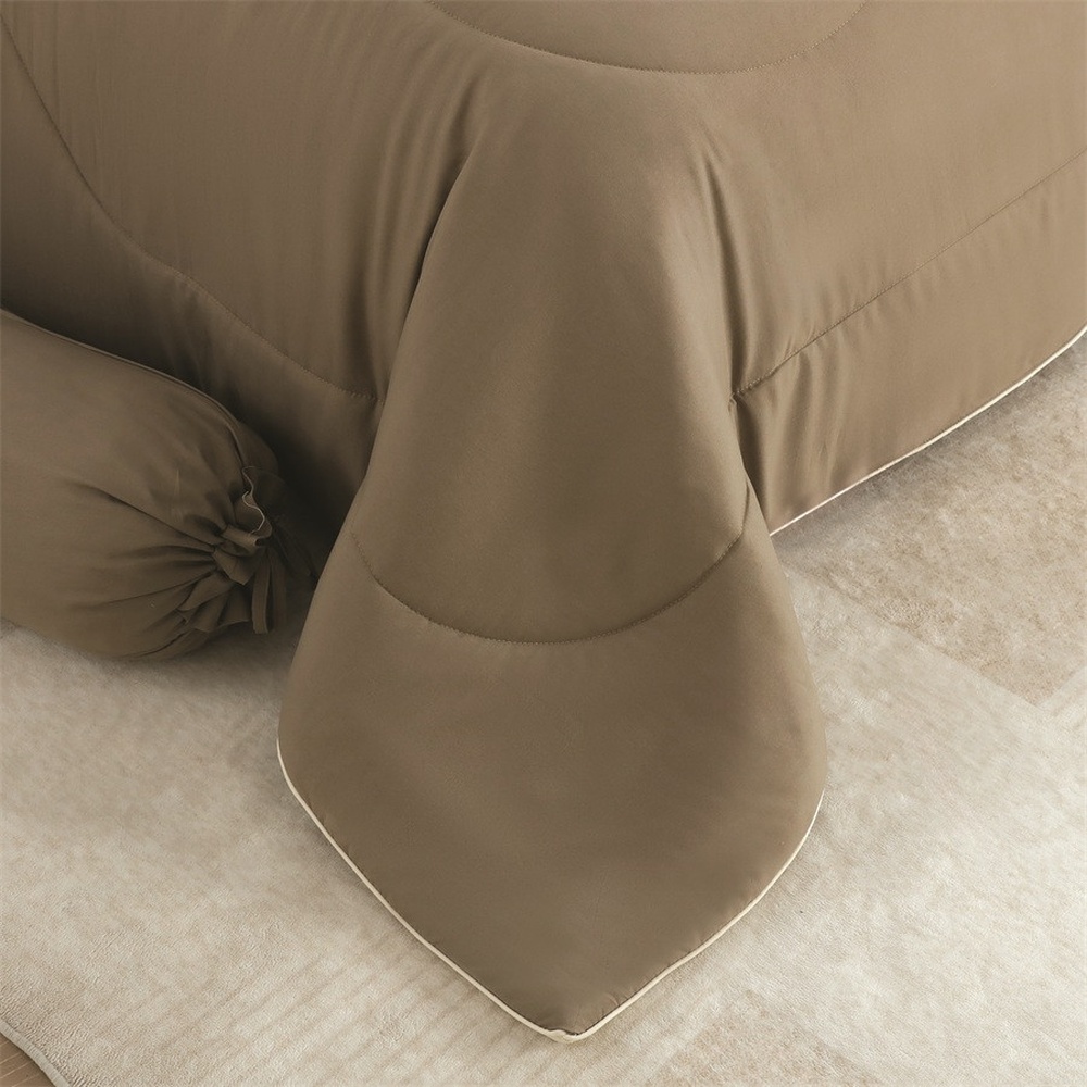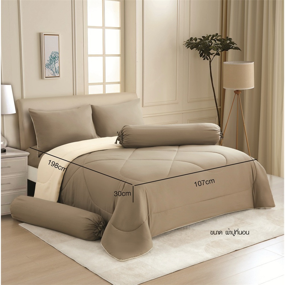 ชุดเครื่องนอนคุณภาพจากแบรนด์ TRUFFLE ดีไซน์เรียบหรู ใช้โทนสีอบอุ่นสองเฉด สีกากีและครีม เหมาะกับทุกสไตล์ห้องนอน