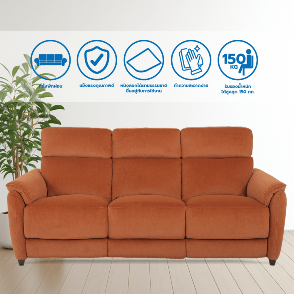 โซฟาที่ตอบโจทย์ทุกการใช้งานด้วยวัสดุ Pro-Tech FABRIC ที่ป้องกันน้ำและคราบสกปรก ทำความสะอาดง่าย ทนทานต่อรอยขีดข่วน เหมาะสำหรับครอบครัวที่มีสัตว์เลี้ยง โซฟาฐานปิดออกแบบให้ชิดพื้น ลดฝุ่นสะสมใต้โซฟา เพิ่มความสะอาดในบ้าน เบาะนั่งปรับเอนได้ด้วยระบบไฟฟ้า สะดวกสบายทุกการใช้งาน พร้อมพอร์ต USB Type-A และ Type-C สำหรับชาร์จอุปกรณ์ต่าง ๆ ได้ทันที โครงสร้างผลิตจากไม้เบิร์ชแท้ แข็งแรงทนทาน รองรับน้ำหนักได้สูงสุด 120 กก. เบาะรองนั่งบุฟองน้ำคุณภาพสูงที่ออกแบบให้เหมาะสมกับสรีระ พร้อมสปริงขดช่วยกระจายน้ำหนัก ลดแรงกดทับ นั่งนานไม่เมื่อยล้า เบาะรองแขนเสริมความนุ่มนวลให้ความสบายเพิ่มขึ้น ดีไซน์ทันสมัย หรูหรา เหมาะกับทุกสไตล์บ้าน ให้คุณพักผ่อนและรับรองแขกได้อย่างสมบูรณ์แบบ รุ่น Orchard คือโซฟาที่ผสมผสานความสวยงาม ฟังก์ชันครบครัน และความทนทานไว้อย่างลงตัว ตอบโจทย์ทุกไลฟ์สไตล์ในบ้านคุณ