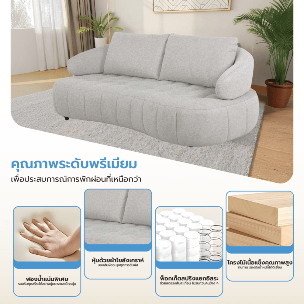 ในด้านความสบาย โซฟารุ่นนี้มาพร้อม เบาะนั่งบุฟองน้ำเกรดพรีเมียม ให้ความนุ่มแน่นในระดับที่พอดี รองรับสรีระได้อย่างดีเยี่ยม ให้ความรู้สึกสบายทุกครั้งที่คุณเอนตัวลงนั่ง ไม่ว่าจะใช้นั่งดูหนัง พักผ่อน หรือเอนนอนอ่านหนังสือในวันสบาย ๆ ก็สัมผัสได้ถึงความผ่อนคลายอย่างแท้จริง