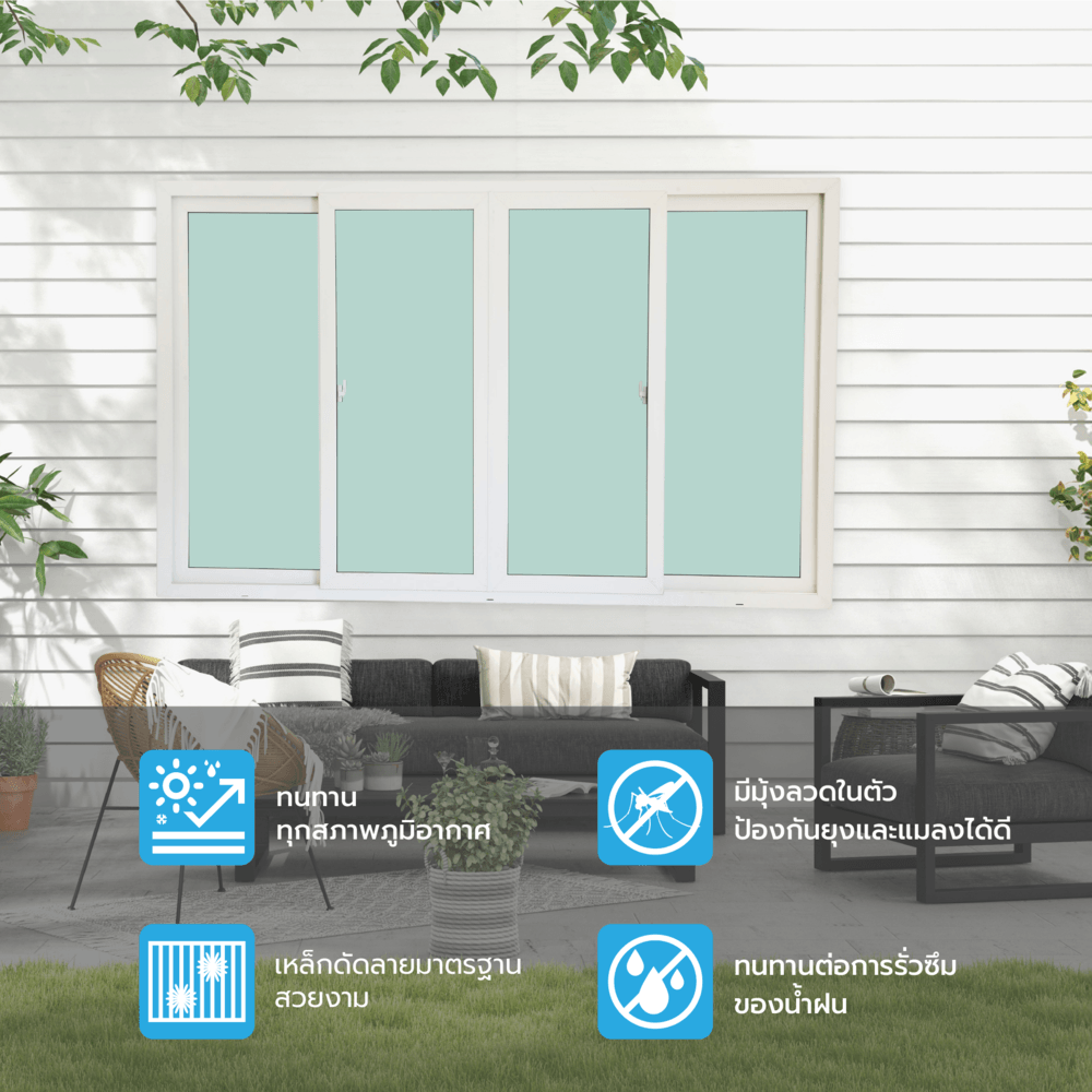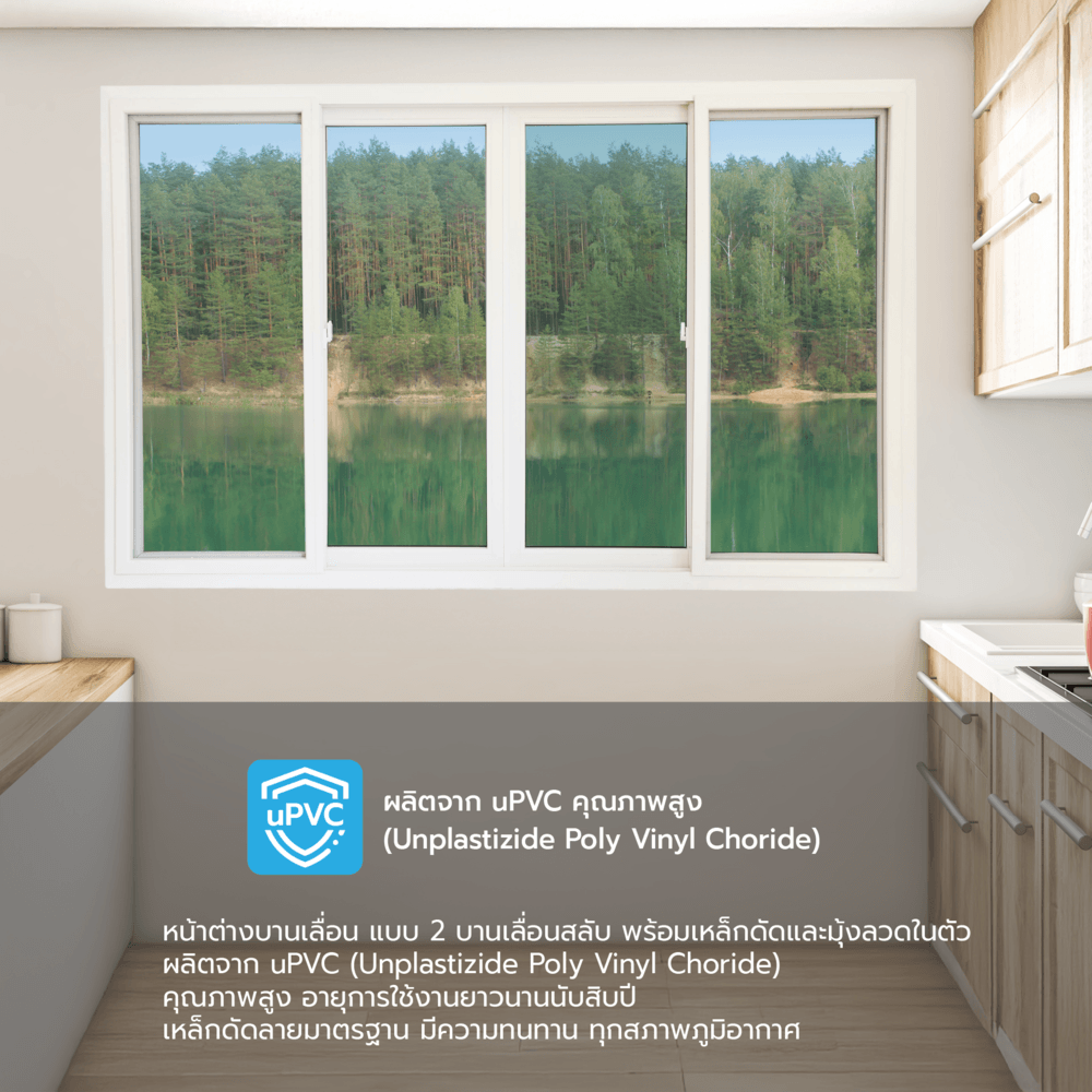 วัสดุกรอบบาน: uPVC (Unplasticized Polyvinyl Chloride) คุณภาพสูง ไม่ลามไฟ ไม่เป็นสนิม ปราศจากสารตะกั่ว