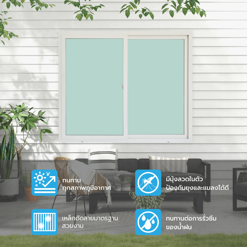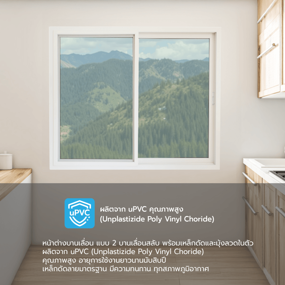 วัสดุกรอบบาน: uPVC (Unplasticized Polyvinyl Chloride) คุณภาพสูง ไม่ลามไฟ ไม่เป็นสนิม ปราศจากสารตะกั่ว